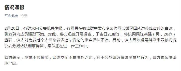 2月21日,北京市公安局发布警方通报:2月20日,有群众向公安机关举报,有网民在微信群中发布多条侮辱诋毁卫国戍边英雄官兵的言论,引发群内成员强烈不满。对此,警方迅速开展调查,于当日21时许,将该网民陈某强(男,28岁)查获,该人对为发泄个人情绪发表违法言论的事实供认不讳。目前,该人因涉嫌寻衅滋事罪被海淀公安分局依法刑事拘留,案件正在进一步工作中。