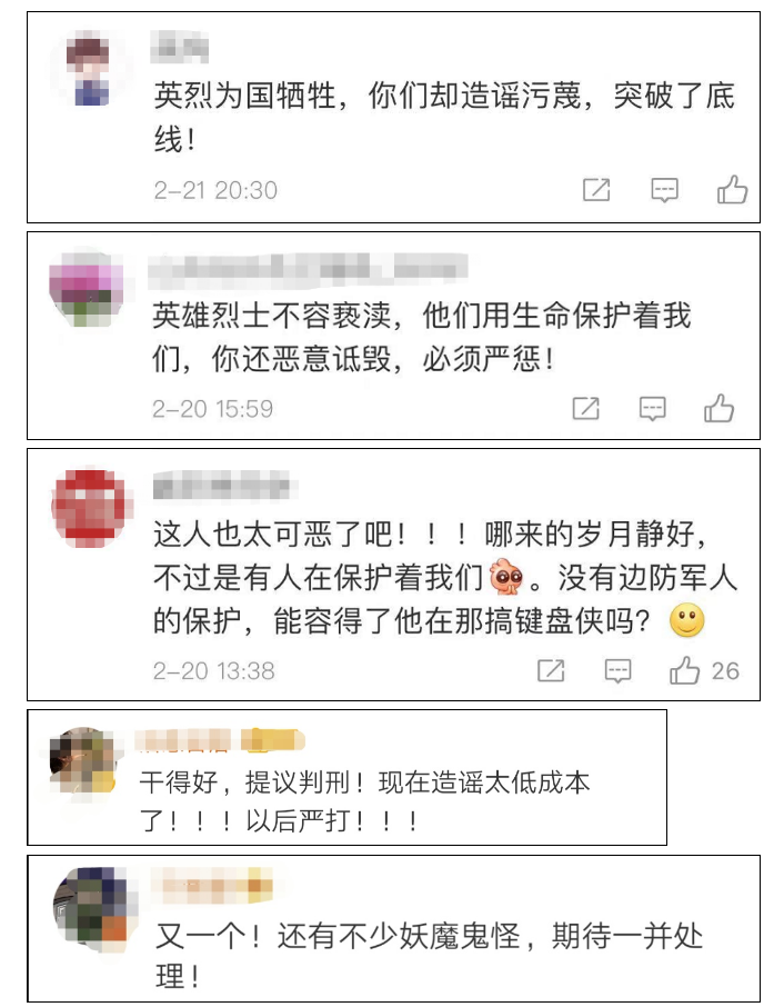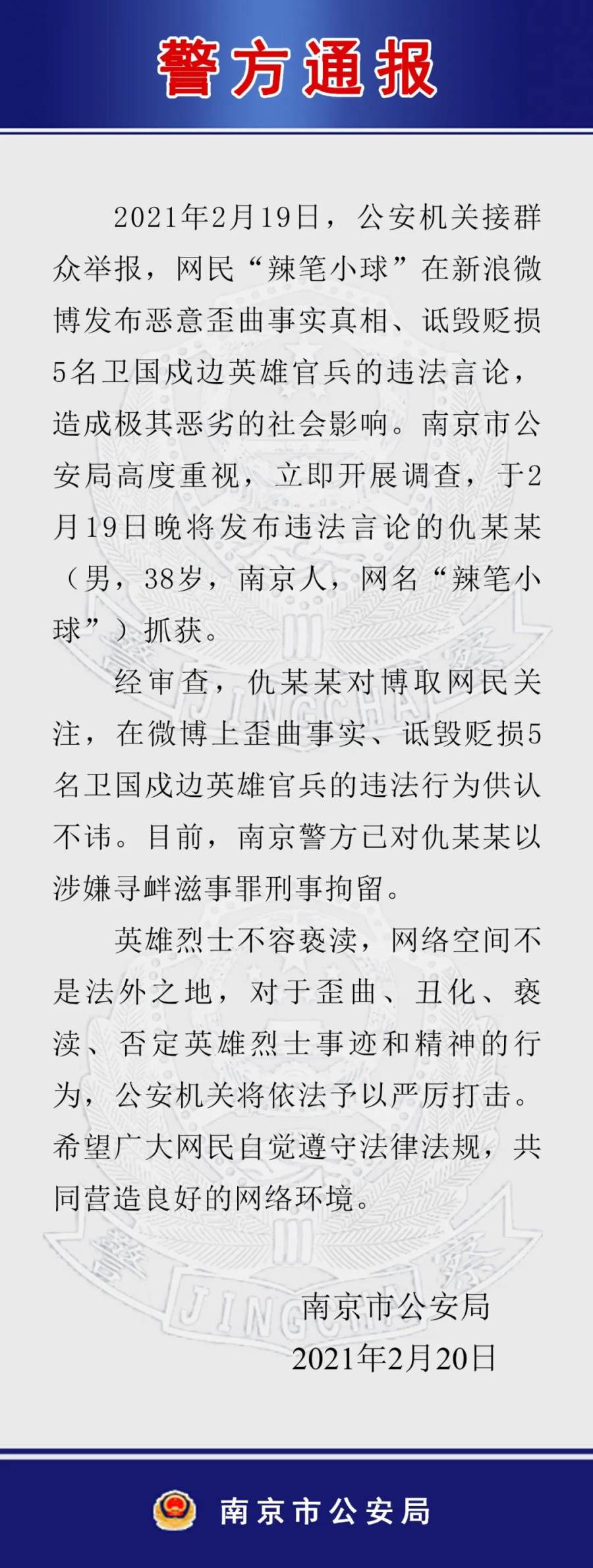 2月20日,南京市公安局发布警方通报:2月19日,公安机关接群众举报,网民“辣笔小球”在新浪微博发布恶意歪曲事实真相、诋毁贬损5名卫国戍边英雄官兵的违法言论,造成极其恶劣的社会影响。南京市公安局高度重视,立即开展调查,于2月19日晚将发布违法言论的仇某某(男,38岁,南京人,网名“辣笔小球”)抓获。
