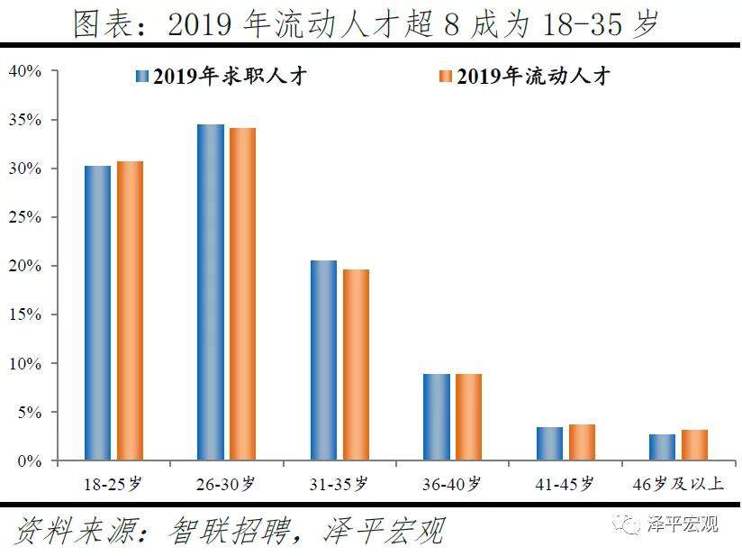 2)从年龄看,流动人才中超8成为18-35岁。2019年求职人才中18-25岁、26-30岁、31-35岁、36-40岁、41-45岁、46岁及以上分别占比30.2%、34.5%、20.5%、8.8%、3.4%、2.6%;流动人才中各年龄段人才分别占比30.7%、34.1%、19.6%、8.8%、3.7%、3.1%,求职人才和流动人才的年龄结构较为吻合,18-35岁分别占比85.1%、84.4%,而在2018年上述比例分别为86.1%、78.6%,2019年流动人才更加集中于18-35岁。