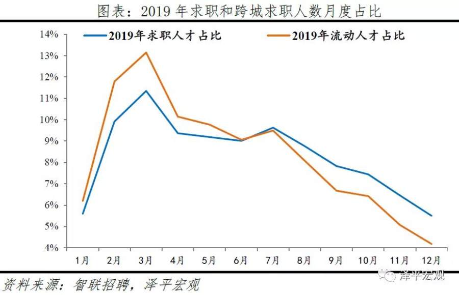 数据说明及特征:智联招聘拥有约2亿个人注册用户,日均活跃用户数(含登录、有求职行为的用户)约630万,其中,求职人才即当年有简历投递行为的用户中约85%为专科及以上学历,远超全国就业人口总体的14.6%(2015年小普查数据);在求职人才中,约四成为跨城求职者,即现居住城市和简历投向城市不同的流动人才。人才求职和跨城求职具有明显的月度波动性,求职高峰一般在春节后的3月,2019年3月求职人数和流动人数占比分别为11.3%、13.1%,2018年分别为12.1%、12.3%。
