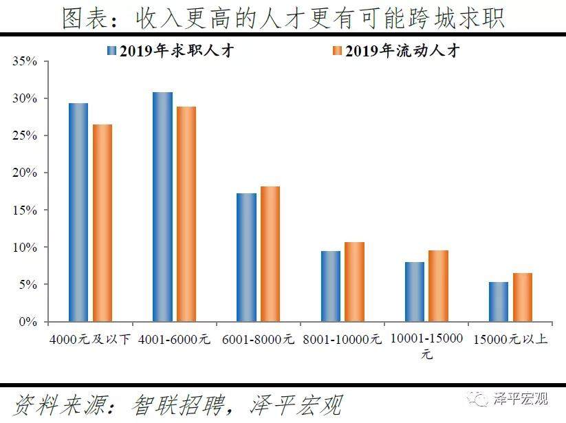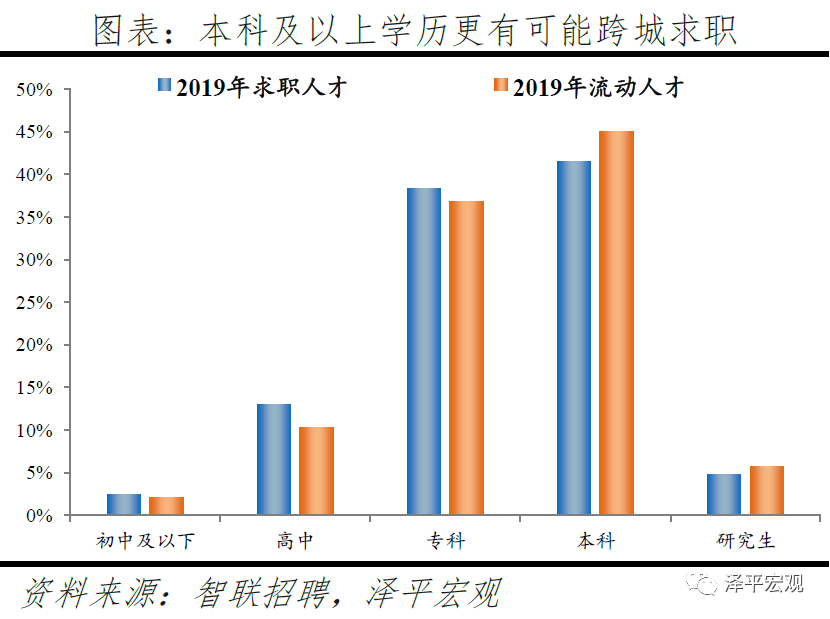 3)从学历看,流动人才中52%为本科及以上学历,明显高于求职总体的47%,表明高学历人才更有可能跨城求职。2019年求职人才中初中及以下、高中、专科、本科、研究生学历占比分别2.5%、13.0%、38.4%、41.5%、4.7%,其中流动人才各学历分别占比为2.1%、10.4%、36.8%、45.0%、5.7%,流动人才中本科、研究生学历比重均高于整体水平,2019年流动人才中本科及以上学历占比50.7%、较求职整体的46.2%高出4.5个百分点,而在2018年上述比例分别为50.5%、47.5%,说明本科及以上的求职者职场竞争力较强、更有可能跨城求职。