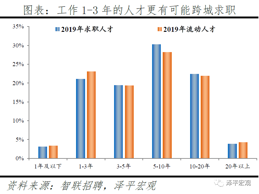 4)从工作年限看,流动人才中46%工作5年及以下,高于求职总体的44%,职场新人更有可能跨城求职。2019年求职人才中工作年限为1年及以下、1-3年、3-5年、5-10年、10-20年、20年以上分别占3.1%、21.1%、19.4%、30.3%、22.3%、3.8%,流动人才中各工作年限人才分别占比3.3%、23.0%、19.3%、28.2%、21.9%、4.3%,其中工作5年以下的分别占比43.6%、45.7%,说明部分职场新人的职业发展和生活愿景尚有较大不确定性、更有可能跨城求职。而在2018年上述比例分别为39.3%、40.4%,2019年流动人才更加集中于5年及以下。