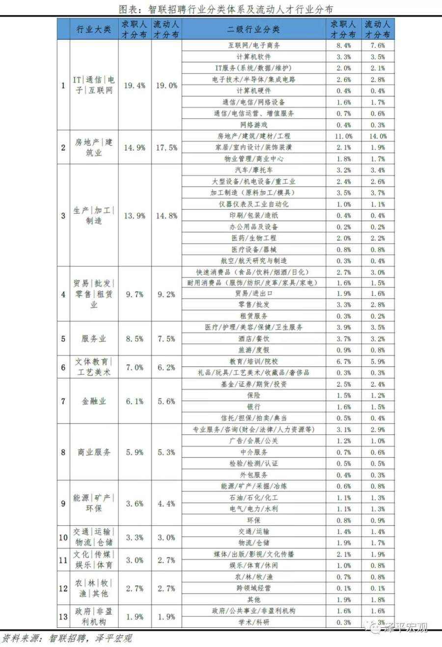 6)从行业看,流动人才中51%分布在IT、房地产、制造业,高于求职人才总体的48%。2019年求职人才最多的前三行业是IT|通信|电子|互联网、房地产|建筑业、生产|加工|制造,分别占比19.4%、14.9%、13.9%,合计占比48.3%;流动人才最多的前三行业也是上述三个行业,分别占比19.0%、17.5%、14.8%,合计占比51.4%,说明流动人才分布更加集中,且流动人才在房地产|建筑业的分布远高于求职人才。从二级行业分布来看,2019年求职人才最多的前五行业分别是房地产/建筑/建材/工程、互联网/电子商务、教育/培训/院校、医疗/护理/美容/保健/卫生服务、酒店/餐饮,合计占比33.7%;流动人才最多的前五行业则略有不同,第四和第五名分别是加工制造(原料加工/模具)、医疗/护理/美容/保健/卫生服务,合计占比34.7%。