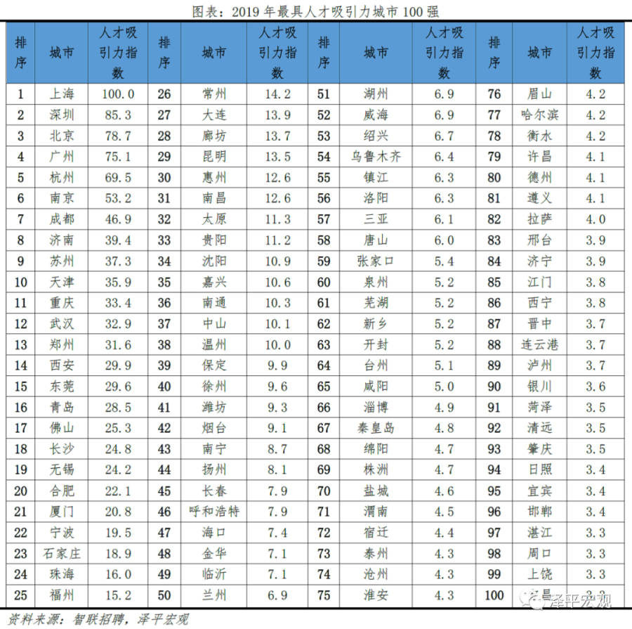 2.1中国最具人才吸引力城市100强:沪深京居前三