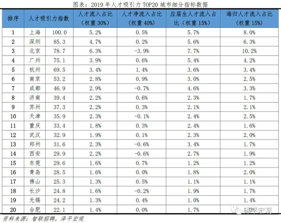 从人才吸引力指数观察,2019年上海、深圳、北京位居前三名,上海连续三年第一,广州、杭州、南京、成都、济南、苏州、天津位居前十。为衡量城市的人才吸引力,定义人才吸引力指数为人才流入占比、人才净流入占比、应届生人才流入占比、海归人才流入占比的加权结果。人才流入占比=流入某城市的人才/全国流动人才总量,人才净流入占比=(流入某城市的人才-流出某城市的人才)/全国流动人才总量,分别反映该城市引得来和留得住的能力。其中,流入某城市的人才指现居住地不在该城市、但简历投向了该城市的人才;流出某城市的人才指现居住地为该城市、但简历投向了其他城市的人才;全国流动人才总量指现居住地和简历投向地不一致的人才。应届生人才流入占比=流入某城市的应届生流动人才/应届生流动人才总量,海归人才流入占比=流入某城市的海归流动人才/海归流动人才总量,分别反映城市对年轻高学历人才和海归高学历人才的吸引力。从结果看,经济体量大且增长稳定的上海市人才吸引力指数2017年由第二名升至第一名,随后三年持续第一;由于深圳经济发展速度较快且人才政策吸引力强,2016-2019年深圳排名第3、3、3、2位;北京因严控人口、疏解产业,排名为第1、2、2、3位,有所下降;广州则始终为第4位;杭州因电商为代表的产业发展迅速,连续四年稳居第5;南京为第6、6、7、6名;成都2019年为第7名且近三年较为稳定;济南2019年为第8名,比2018年的第14名有所上升;苏州为第7、8、9、9,较为稳定;天津为第8、10、12、10名。2019年前50强中,东部、中部、西部、东北地区分别有33、6、8、3个;一二三四线分别有4、32、14、0个,分别占一二三四线城市数量的100%、91%、17%、0%;长三角、珠三角、京津冀、成渝、长江中游城市群分别有12、7、5、2、3个。