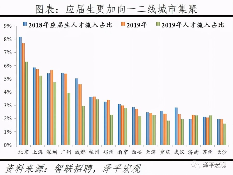 重点城市:深广杭宁渝汉人才净流入占比逐渐上升。1)一线城市:北上人才净流入占比逐年下降、深广呈上升趋势。北京2016-2019年人才净流入占比分别为-0.7%、-2.3%、-2.7%、-3.9%,持续为负且降幅扩大,主因北京严控人口、疏解产业,北京和上海互为人才外流第一目标城市,北京流向上海、上海流向北京的人才流出占比分别为0.8%、0.6%,人才从北京净流向上海;上海2016-2019年人才净流入占比分别为1.3%、1.2%、0.9%、0.5%,持续净流入但逐渐下降,主因上海控制人口及产业转移;深圳2016-2019年人才净流入占比分别为-0.2%、0.1%、0.4%、0.2%,主因深圳活力强、人才政策吸引力大;深圳和广州互为人才外流第一目标城市,深圳流向广州和广州流向深圳的人才流出占比分别为0.7%、0.6%,规模基本平衡;广州2016-2019年人才净流入占比分别为0.3%、0.5%、0.5%、0.6%,持续稳定净流入,主因广州发展速度较快、生活成本在一线城市中最低。2)二线城市:杭宁渝汉人才净流入占比呈上升趋势,津蓉有所下降。杭州2016-2019年人才净流入占比分别为0.8%、1.0%、1.2%、1.4%,始终为正且逐年攀升,主因杭州以电商为代表的产业发展迅速、薪酬超越广州在十大城市中位列第四;南京2016-2019年人才净流入占比分别为0.8%、0.9%、0.9%、0.9%,始终为正且比较稳定,主因南京发展速度较快且2018年“宁聚计划”实施吸引人才;重庆2016-2019年人才净流入占比分别为-0.1%、-0.1%、0.5%、0.3%,2018年由负转正主因信息技术产业等发展吸引人才;武汉2016-2019年人才净流入占比分别为-0.3%、0.0%、0.8%、0.1%,2017年由负转正,主因2017年“百万大学生留汉”政策实施;天津2016-2019年人才净流入占比分别为0.2%、0.1%、-0.1%、-0.1%,逐年下降且2018年由正转负,主因天津发展速度放缓、2019年GDP增速5.3%在十城中最低、且薪资在十城中最低;成都2016-2019年人才净流入占比分别为-0.8%、-0.3%、-0.3%、-0.6%,始终为负,主因薪资水平较低,重庆与成都互为人才外流第一目标城市,人才从成都净流向重庆。
