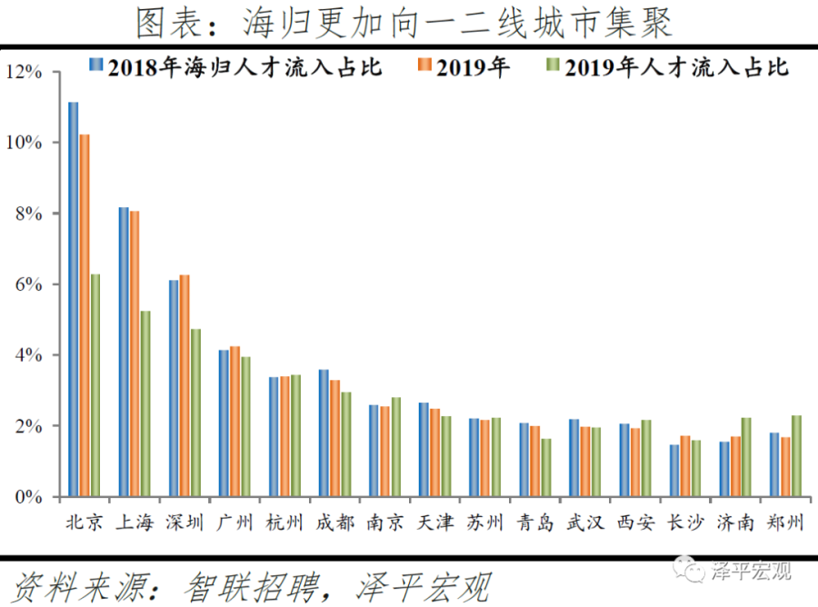 2019年应届生、海归将简历投向北上深广的比重分别占比24.5%、28.7%,均高于流动人才流向北上广深的整体比重20.2%,应届生和海归更倾向往一二线城市集聚。从应届生看,应届生人才流入占比前四名分别是北上深广,合计占比24.5%,高于北上深广的人才流入占比20.2%;应届生人才流入前十城市还有成都、杭州、郑州、南京、西安、天津,前十合计占比45.2%,高于前十城市的人才流入占比36.1%,意味着和流动人才相比,应届生人才更加向一二线城市集聚。和2018年相比,2019年流入北京、武汉、成都的应届生占比分别下降0.5%、0.5%、0.4%,流入济南、深圳的应届生占比分别上升0.3%、0.2%。从海归看,海归人才流入占比前四名分别是北上深广,合计占比28.7%,高于北上广深人才流入占比的20.2%;海归人才流入前十城市还有杭州、成都、南京、天津、苏州、青岛,前十合计占比44.6%,高于前十城市的人才流入占比35.5%,意味着和流动人才相比,海归人才也更加向一二线城市集聚,尤其是向一线城市集聚。和2018年相比,流入北京、成都的海归人才占比分别下降0.9%、0.3%,流入东莞、深圳、长沙、无锡的人才分别上升0.3%、0.2%、0.2%、0.2%。