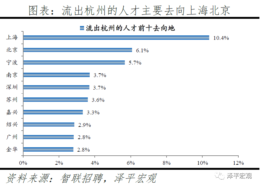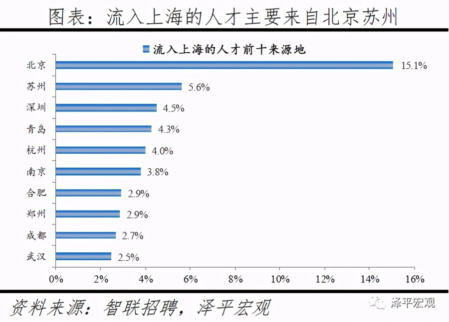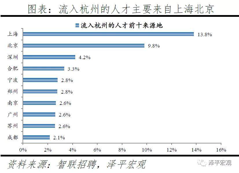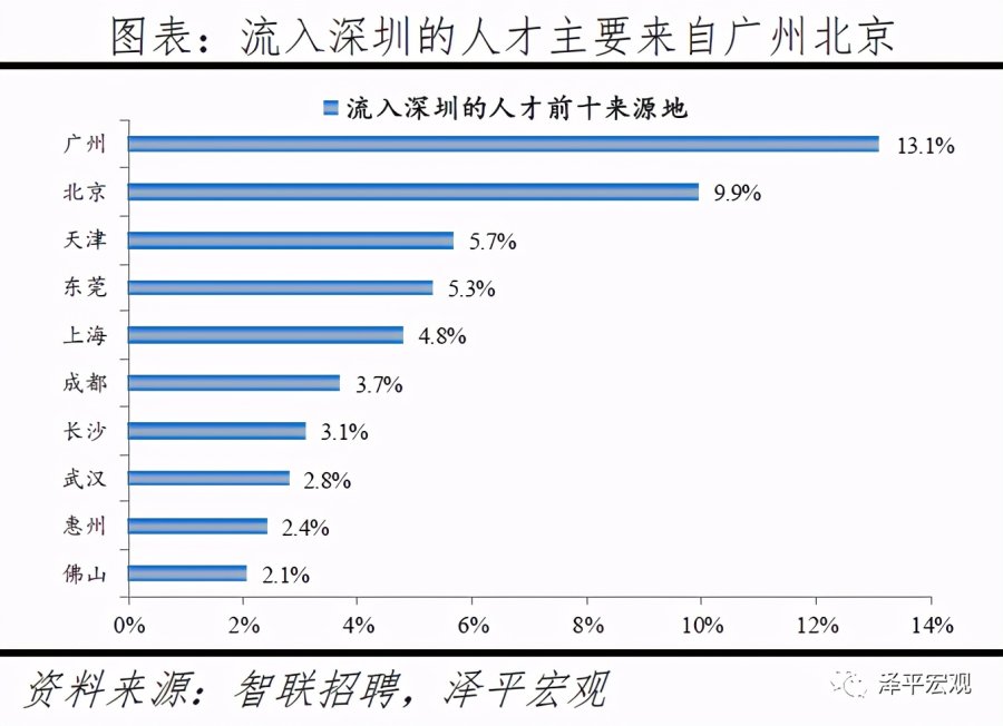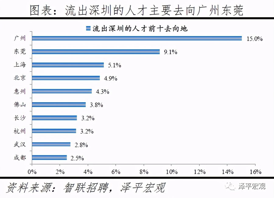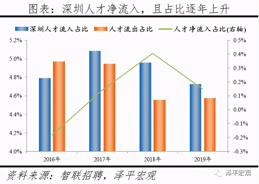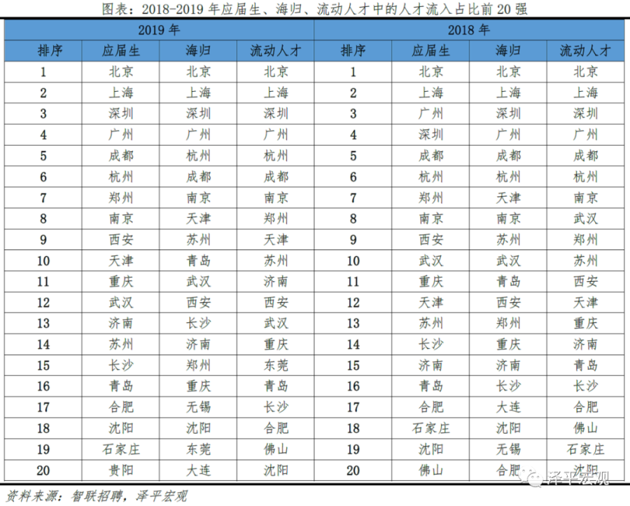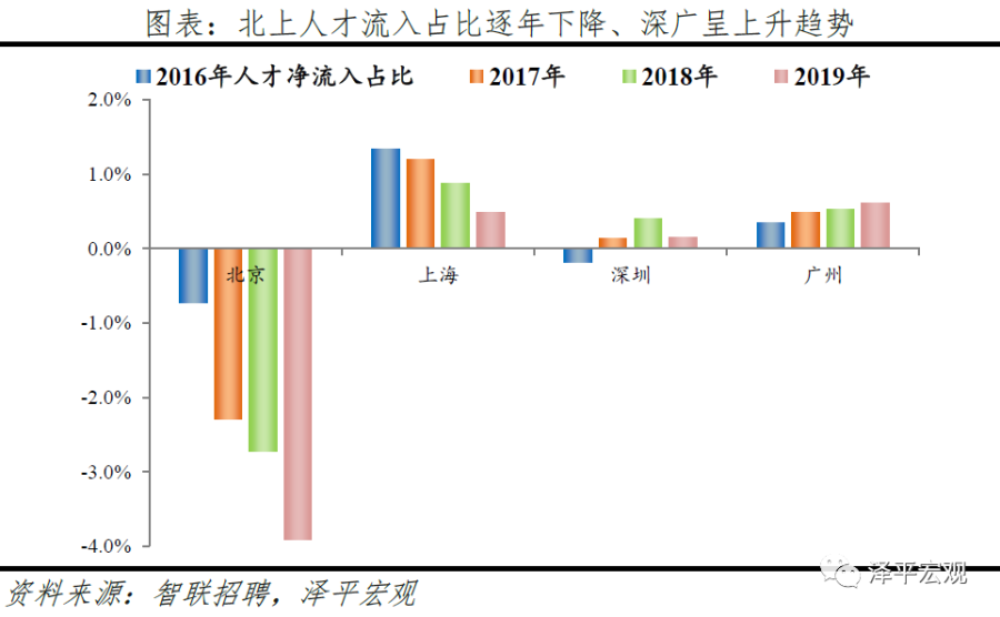 3)深圳:2016-2019年人才净流入占比分别为-0.2%、0.1%、0.4%、0.2%,主因深圳经济发展速度较快、人才政策有吸引力;深圳和广州互为人才外流第一目标城市,深圳流向广州和广州流向深圳的人才流出在全国流动人才总量中占比分别为0.7%、0.6%,规模基本平衡。2015年深圳常住人口增量从2014年的15万大幅上升至60万,2015-2018年平均增量为56万。2016-2019年深圳人才流入占比基本稳定在4.9%左右,分别为4.8%、5.1%、5.0%、4.7%,但人才流出占比呈下降趋势,分别为5.0%、4.9%、4.6%、4.6%。从来源看,人才向深圳流入的前十大城市分别为广州、北京、天津、东莞、上海、成都、长沙、武汉、惠州、佛山,合计占比达52.8%,高于2018年前十来源地的50.4%,深圳的人才来源集中度有所提高。其中,珠三角城市有4个,占比22.9%;流入深圳的人才中13.1%来自广州,流入广州的人才中17.4%来自深圳,深圳和广州互为人才来源城市的第1位。人才流入深圳主要因为经济发展速度相对较快和人才政策有吸引力。2019年深圳GDP增速6.7%,高于全国平均的6.1%,也高于北京和上海的6.1%、6.0%;2016-2019年深圳平均GDP增速为8.0%,高于广州、北京、上海的7.0%、6.6%、6.6%。深圳还拥有华为、腾讯、平安等众多著名企业,尤其是互联网企业,吸引大量人才。深圳的落户政策逐渐放宽,且补贴幅度较大,根据深圳市人力资源和社会保障局数据,2016年深圳将全日制本科生、硕士、博士的租房相关补贴从6000、9000、12000元分别提高至15000、25000、30000元,2017年落户门槛放宽至35岁以下专科学历人才,对新引进的两院院士和杰出人才、地方级领军人才、后备级人才分别给予300万、200万、160万的奖励。从去向看,深圳人才外流的前十大城市分别为广州、东莞、上海、北京、惠州、佛山、长沙、杭州、武汉、成都,合计占比达53.9%,低于2018年前十去向地的56.4%,深圳人才流向的方向更加分散。其中,广州占比达15.0%,珠三角城市有4所,合计占比32.3%,深圳和珠三角地区人才流动频繁;流出深圳的人才中15.0%流向广州,流出广州的人才中18.6%流向深圳,深圳和广州互为人才外流目标城市的第1位,深圳流向广州和广州流向深圳的人才流出在全国流动人才总量中占比分别为0.7%、0.6%,规模基本平衡。
