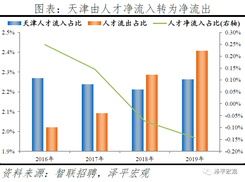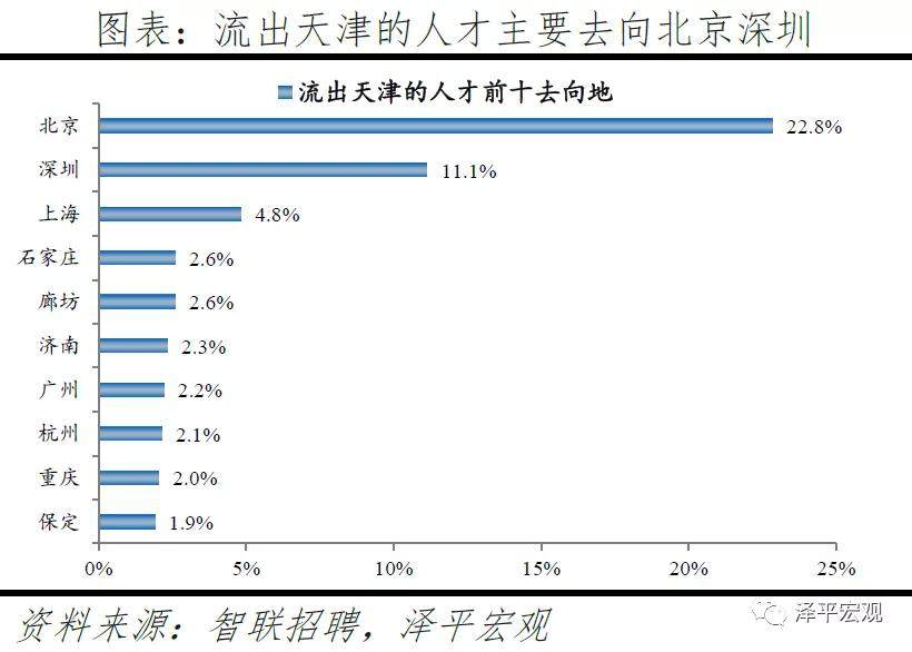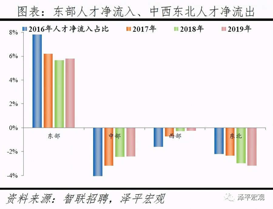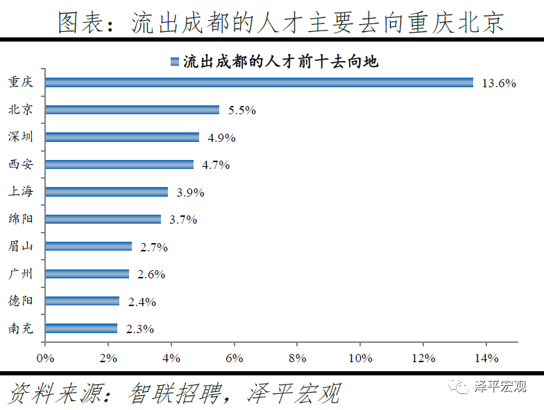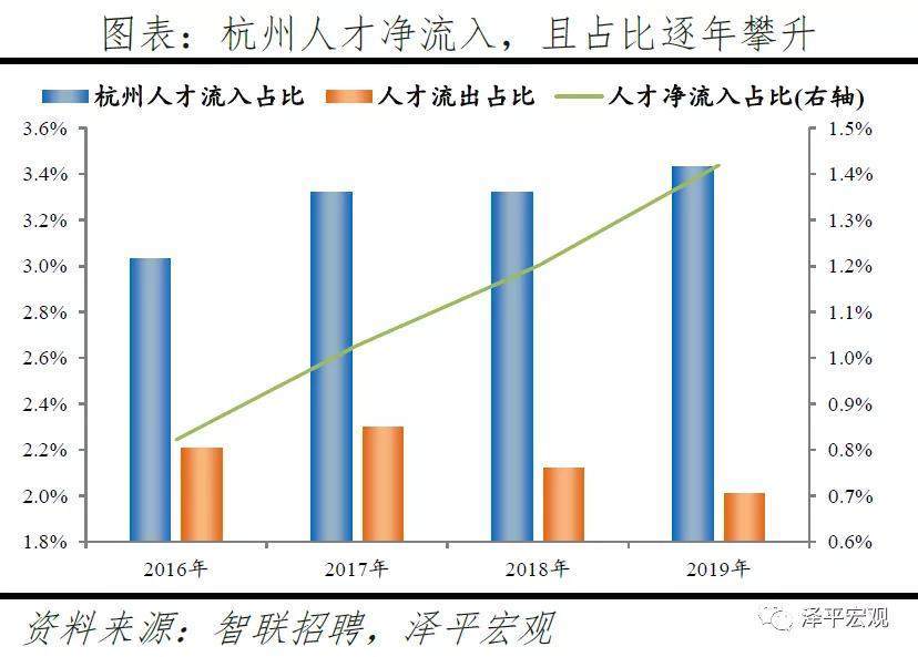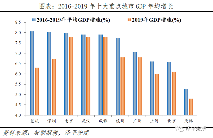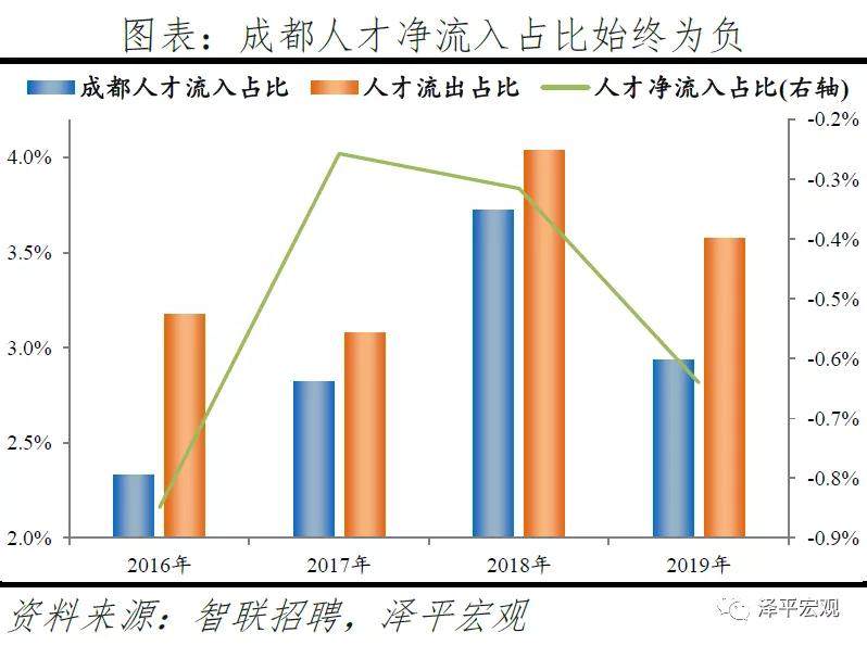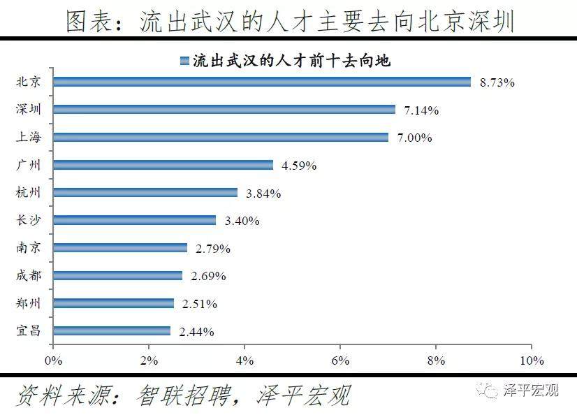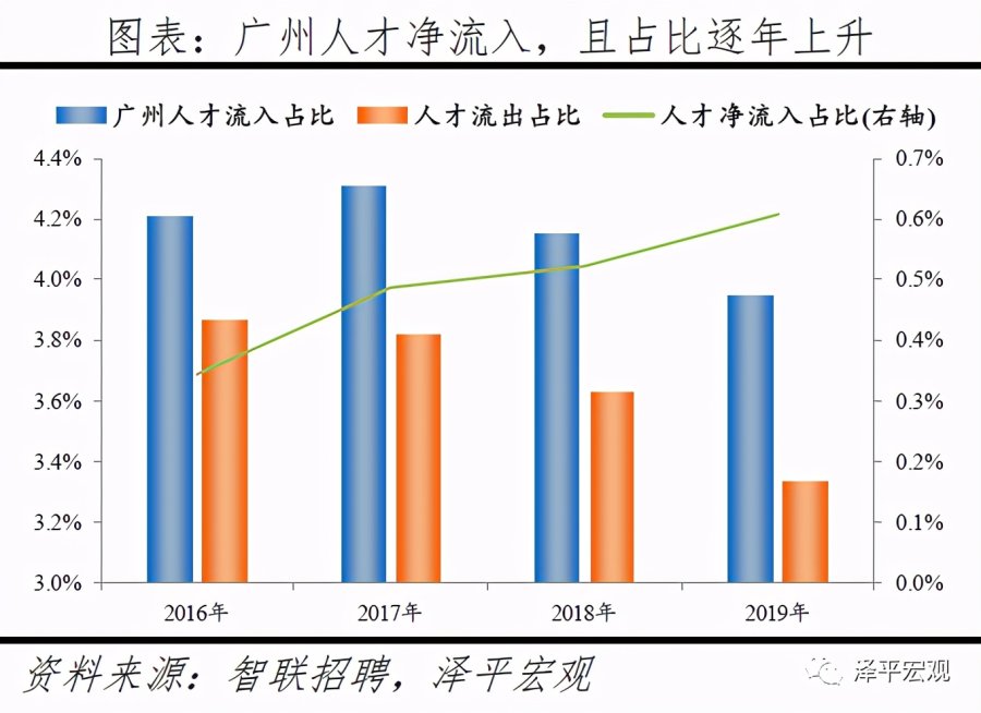 3)深圳:2016-2019年人才净流入占比分别为-0.2%、0.1%、0.4%、0.2%,主因深圳经济发展速度较快、人才政策有吸引力;深圳和广州互为人才外流第一目标城市,深圳流向广州和广州流向深圳的人才流出在全国流动人才总量中占比分别为0.7%、0.6%,规模基本平衡。2015年深圳常住人口增量从2014年的15万大幅上升至60万,2015-2018年平均增量为56万。2016-2019年深圳人才流入占比基本稳定在4.9%左右,分别为4.8%、5.1%、5.0%、4.7%,但人才流出占比呈下降趋势,分别为5.0%、4.9%、4.6%、4.6%。从来源看,人才向深圳流入的前十大城市分别为广州、北京、天津、东莞、上海、成都、长沙、武汉、惠州、佛山,合计占比达52.8%,高于2018年前十来源地的50.4%,深圳的人才来源集中度有所提高。其中,珠三角城市有4个,占比22.9%;流入深圳的人才中13.1%来自广州,流入广州的人才中17.4%来自深圳,深圳和广州互为人才来源城市的第1位。人才流入深圳主要因为经济发展速度相对较快和人才政策有吸引力。2019年深圳GDP增速6.7%,高于全国平均的6.1%,也高于北京和上海的6.1%、6.0%;2016-2019年深圳平均GDP增速为8.0%,高于广州、北京、上海的7.0%、6.6%、6.6%。深圳还拥有华为、腾讯、平安等众多著名企业,尤其是互联网企业,吸引大量人才。深圳的落户政策逐渐放宽,且补贴幅度较大,根据深圳市人力资源和社会保障局数据,2016年深圳将全日制本科生、硕士、博士的租房相关补贴从6000、9000、12000元分别提高至15000、25000、30000元,2017年落户门槛放宽至35岁以下专科学历人才,对新引进的两院院士和杰出人才、地方级领军人才、后备级人才分别给予300万、200万、160万的奖励。从去向看,深圳人才外流的前十大城市分别为广州、东莞、上海、北京、惠州、佛山、长沙、杭州、武汉、成都,合计占比达53.9%,低于2018年前十去向地的56.4%,深圳人才流向的方向更加分散。其中,广州占比达15.0%,珠三角城市有4所,合计占比32.3%,深圳和珠三角地区人才流动频繁;流出深圳的人才中15.0%流向广州,流出广州的人才中18.6%流向深圳,深圳和广州互为人才外流目标城市的第1位,深圳流向广州和广州流向深圳的人才流出在全国流动人才总量中占比分别为0.7%、0.6%,规模基本平衡。