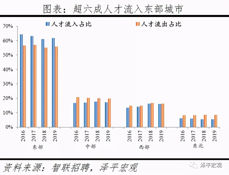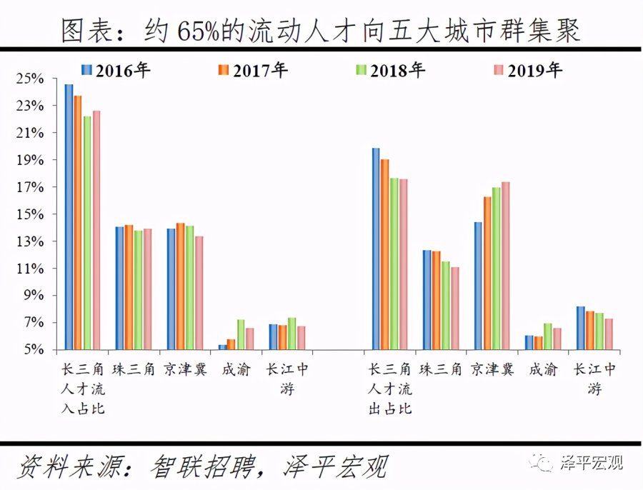 3)分城市群看,超6成人才流向五大城市群,2019年长三角、珠三角、京津冀、成渝、长江中游城市群人才净流入占比分别为5.0%、2.8%、-4.0%、0.0%、-0.5%,长三角、珠三角人才集聚,京津冀受北京控人影响人才净流出,成渝和长江中游基本平衡。从人才流入流出占比看,长三角人才流入占比和人才流出占比均呈下降趋势,2019年分别为22.6%、17.6%;珠三角人才流入占比较为稳定,人才流出占比分别逐年微降,2019年分别为13.9%、11.1%;京津冀2016-2019年人才流出占比分别为14.3%、16.2%、17.0%、17.3%,逐年上升;成渝人才流入占比和人才流出占比均较为稳定;长江中游人才流出占比逐年下降。2016-2019年分别有64.6%、64.7%、64.5%、63.1%的人才流入五大城市群,均超6成。从人才净流入占比看,2016-2019年长三角分别为4.7%、4.6%、4.6%、5.0%,人才净流入且占比高于其他城市群,人才大量向长三角集聚;珠三角分别为1.7%、2.0%、2.2%、2.8%,人才净流入且逐年上升;京津冀分别为-0.4%、-1.9%、-2.9%、-4.0%,人才净流出且流出规模逐渐扩大,主要受北京人才净流入占比逐年大幅下降影响;成渝分别为-0.7%、-0.2%、0.3%、0.0%,流入流出基本平衡;长江中游分别为-1.3%、-1.0%、-0.3%、-0.5%,流入流出基本平衡。