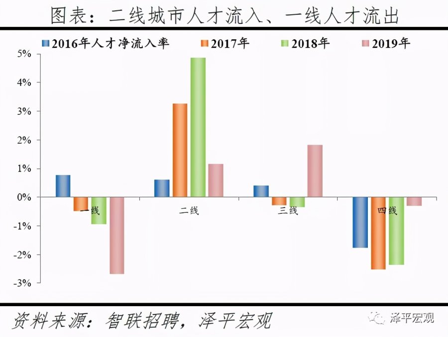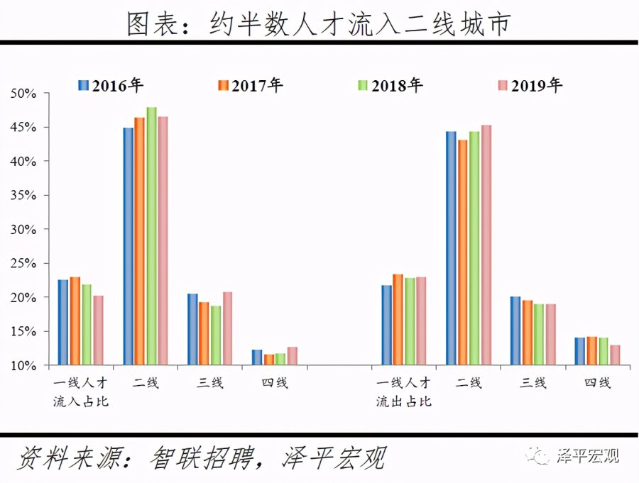2)分线城市看,2019年一线、二线、三线、四线人才净流入占比分别为-2.7%、1.1%、1.8%、-0.3%,2018年分别为-0.9%、4.9%、-0.3%、-2.3%,结合近4年数据观察,一线因京沪控人持续流出,二线人才持续集聚,三线较为平衡,四线持续流出。我们把全国296个地级及以上建制市划分为一二三四线城市,其中,一线城市为北上广深4个,二线城市35个,三线城市81个,四线城市176个(详见恒大研究院2019年4月报告《中国城市发展潜力排名:2019》)。从人才流入流出占比看,2016-2019年一线城市人才流入占比呈下降趋势,人才流出占比基本稳定;二线城市人才流入占比分别为44.9%、46.3%、47.9%、46.4%,呈上升趋势且约半数人才流入二线城市,人才流出占比基本稳定;三线城市人才流入占比分别为20.5%、19.3%、18.6%、20.8%,2019年上升较为明显,人才流出占比逐年下降;四线城市人才流入占比分别为12.2%、11.6%、11.6%、12.6%,2019年上升较为明显,人才流出占比呈下降趋势。从人才净流入占比看,2016-2019年一线分别为0.8%、-0.5%、-0.9%、-2.7%,受京沪控人影响一线人才净流入占比逐年下降,2017年开始由正转负;二线分别为0.6%、3.2%、3.6%、1.1%,二线人才持续集聚;三线分别为0.4%、-0.3%、-0.3%、1.8%,较为平衡;四线分别为-1.8%、-2.5%、-2.3%、-0.3%,人才持续净流出。