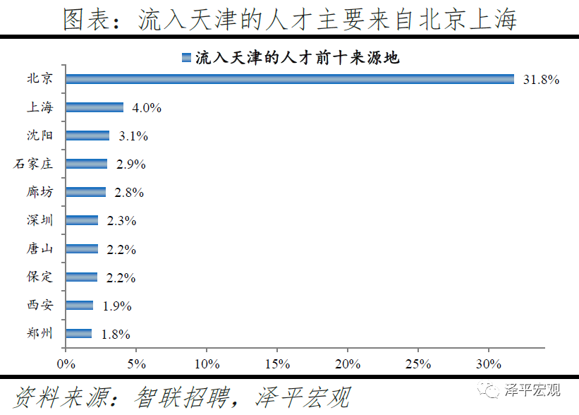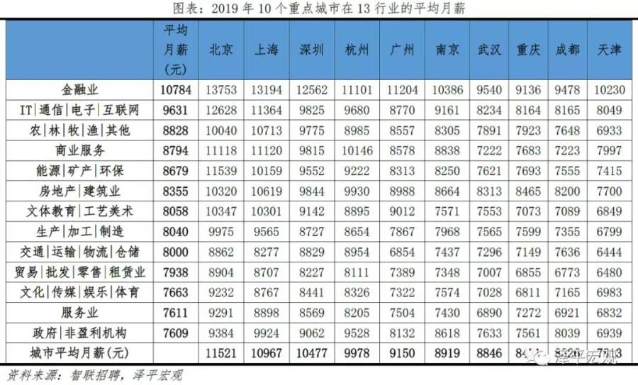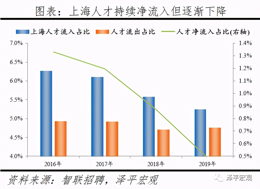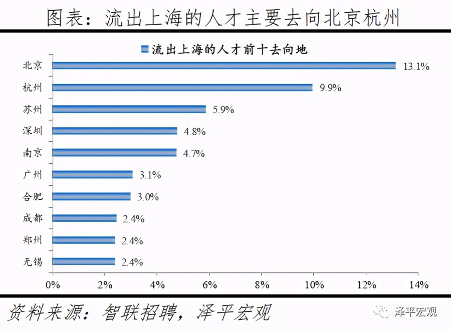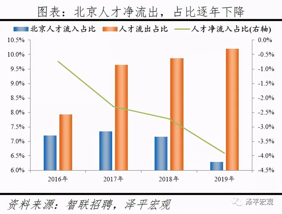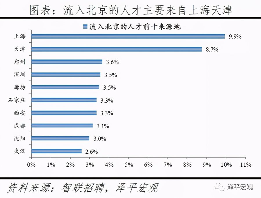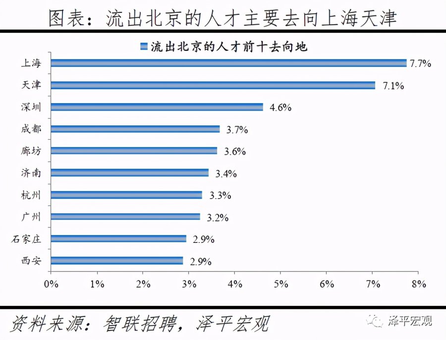 1)北京:2016-2019年人才净流入占比分别为-0.7%、-2.3%、-2.7%、-3.9%,持续为负且降幅扩大,主因北京严控人口、疏解产业;北京和上海互为人才外流第一目标城市,北京流向上海、上海流向北京的人才流出在全国流动人才总量中占比分别为0.8%、0.6%,人才从北京净流向上海。北京常住人口增量逐年下滑,2011-2018年从57万降至-17万,2019年缩窄至-1万,2017-2019年连续3年为负,2016-2019年北京的常住人口增量始终在一线城市中最低。2016-2019年北京人才流入占比分别为7.2%、7.3%、7.1%、6.3%,但人才流出占比持续攀升,分别达7.9%、9.6%、9.9%、10.2%,北京的人才流入和人才流出均居全国城市首位,但流出逐年攀升、流出明显大于流入,使得人才净流入占比分别为-0.7%、-2.3%、-2.7%、-3.9%。从来源看,2019年人才向北京流入的前十大城市分别为上海、天津、郑州、深圳、廊坊、石家庄、西安、成都、沈阳、武汉,合计占比达44.7%。其中,京津冀城市有3个,合计占比达15.6%。人才流入北京主要因为北京经济体量大、薪酬水平高,2019年GDP规模达到3.5万亿,仅次于上海、排名第二,同时13个行业中北京有8个的薪酬位于所有城市之首。从去向看,北京人才外流的前十大城市分别为上海、天津、深圳、成都、廊坊、济南、杭州、广州、石家庄、西安,合计占比达42.5%。其中,流出北京的人才中7.7%流向上海,流出上海的人才中13.1%流向北京,北京和上海互为人才外流目标城市的第1位,北京流向上海和上海流向北京的人才流出在全国流动人才总量中占比分别为0.8%、0.6%,人才从北京净流向上海。流出北京的人才增多主要因为北京控制人口、疏解产业。2013年北京开始严控人口,2015年发布的《京津冀协同发展规划纲要》要求北京外迁非首都核心功能,2020年及之后北京常住人口控制在2300万人以内。根据北京市发改委,截至2019年底,北京市不予办理的工商登记业务累计达2.28万件;2014-2019年北京市退出一般制造业企业2759家,疏解提升市场631个、物流中心122个。根据国家统计局数据,2014-2018年北京规模以上工业企业单位数累计减少489家。2019年北京流出人才的29.7%来源于IT|通信|电子|互联网行业,高于除深圳外的其他8个重点城市,也高于北京流入人才流向该行业的比例23.4%。