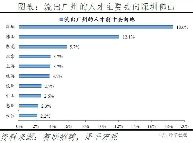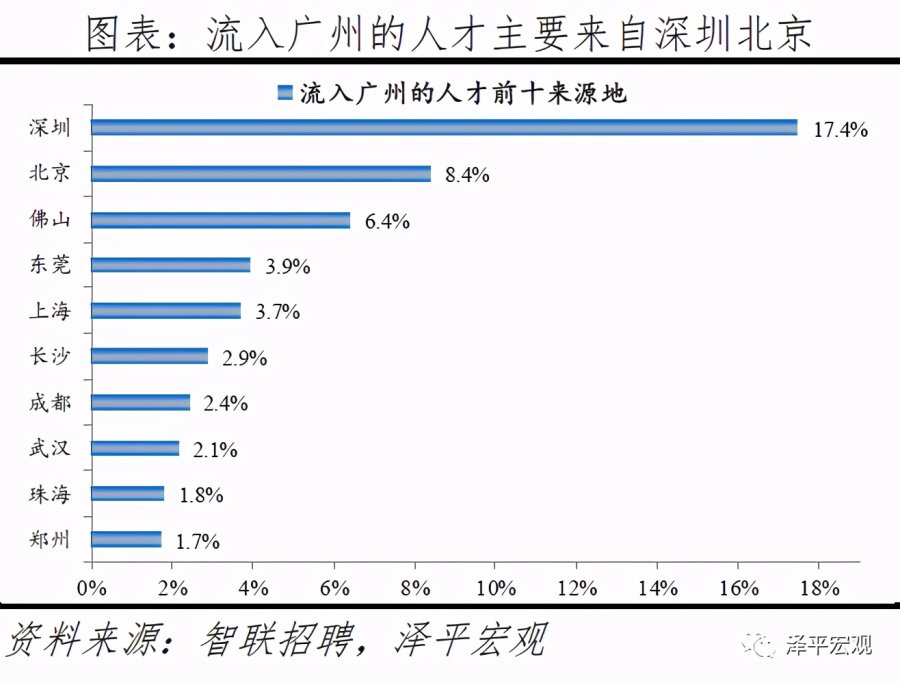 4)广州:2016-2019年人才净流入占比分别为0.3%、0.5%、0.5%、0.6%,人才净流入且持续稳定增长,主因广州发展速度较快、生活成本在一线城市中最低。广州常住人口增量总体呈上升趋势,2011-2019年从4万升至40万。2016-2019年广州人才流入占比基本稳定在4.2%左右,分别为4.2%、4.3%、4.2%、3.9%,2019年略有下降,人才流出占比持续下降,分别为3.9%、3.8%、3.6%、3.3%,流入大于流出,使得人才净流入占比分别为0.3%、0.5%、0.5%、0.6%,逐年上升。从来源看,人才向广州流入的前十大城市分别为深圳、北京、佛山、东莞、上海、长沙、成都、武汉、珠海、郑州,人才流入占比合计达50.8%。其中,深圳占比17.4%,珠三角城市有4个,合计占比29.6%。人才流入广州主要因为发展速度较快、生活成本较低。2019年广州GDP增速为6.8%,高于北京、上海、深圳的6.1%、6.0%、6.7%。广州的生活成本在一线城市中最低,根据英国经济分析智囊机构经济学人智库(EIU)发布的《2019年全球生活成本调查报告》,在全球133个城市样本中,上海与深圳排名并列第25位,北京、广州分别排名49、68位;2018年北京、上海、深圳、广州的房价收入比分别为27.8、21.5、23.8、14.8年,广州的房价和生活成本在一线城市中最低。2019年广州流入人才的13.3%、5.3%流入贸易、批发、零售、租赁业,以及服务业,明显高于其余9个重点城市。从去向看,广州人才外流的前十大城市分别为深圳、佛山、东莞、北京、上海、珠海、杭州、中山、惠州、长沙,人才流出占比合计达57.2%。其中,深圳和佛山占比分别为18.6%、12.1%,珠三角城市有6个,合计占比44.9%,与北京13.6%的人才流向京津冀都市圈、上海25.9%的人才流向长三角都市圈和深圳32.3%的人才流向珠三角都市圈相比,广州人才流向珠三角都市圈城市的比重显著更高。一方面是因为珠三角多为粤语城市、文化相近,另一方面是广州高校数量较多,广东省人才为求学向广州集聚,毕业后从广州回流至省内其他城市。根据教育部数据,广州普通高校数、211高校数分别为37、6所,分别排名第5、6名;根据国家统计局数据,2018年广州普通本专科在校生人数为108.6万人、位列全国第一。