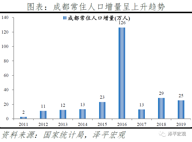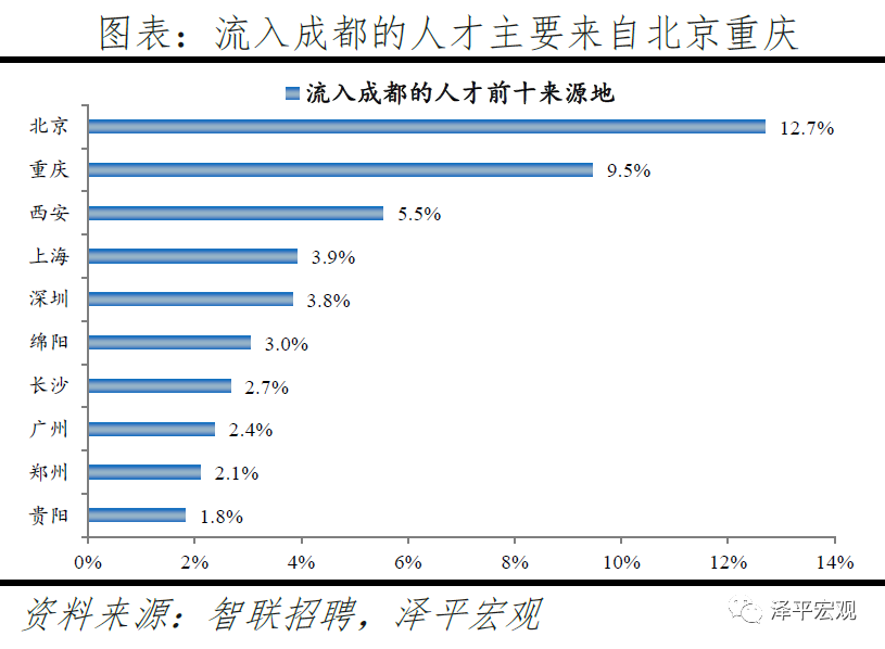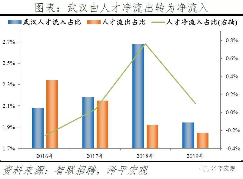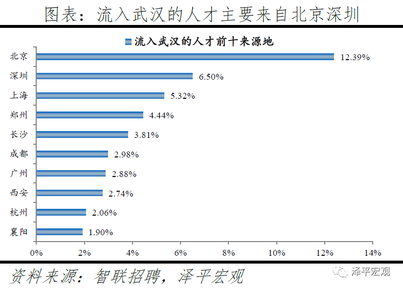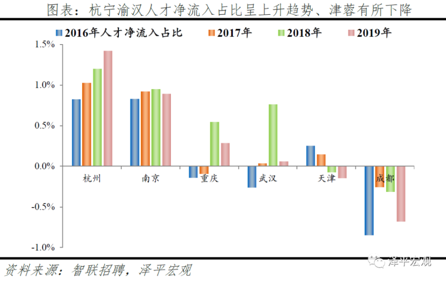 4)武汉:2016-2019年人才净流入占比分别为-0.3%、0.0%、0.8%、0.1%,2017年由负转正,主因“百万大学生留汉”政策实施。2011-2019年武汉常住人口增量平均为16万人,常住人口保持较高增长。2016-2019年武汉人才流入占比分别为2.1%、2.2%、2.7%、1.9%,人才流出占比2.3%、2.1%、1.9%、1.8%,逐年下降,使得人才净流入占比分别为-0.3%、0.0%、0.8%、0.1%。主要因为2017年开始的“百万大学生留汉创业就业工程”,大学生可以低于市场价20%买到安居房或租到租赁房;不满40周岁的留汉大学毕业生可凭毕业证落户,硕士、博士不受年龄限制可直接落户;专科、本科、硕士、博士的指导性最低年薪标准分别为4万元、5万元、6万元、8万元。根据武汉市委组织部,2017-2019年新增留汉大学生共109.5万人,提前两年完成2017年确定的五年达到100万的目标。从来源看,人才向武汉流入的前十大城市分别为北京、深圳、上海、郑州、长沙、成都、广州、西安、杭州、襄阳,合计占比达45.0%。从去向看,武汉人才外流的前十大城市分别为北京、深圳、上海、广州、杭州、长沙、南京、成都、郑州、宜昌,合计占比达45.1%。