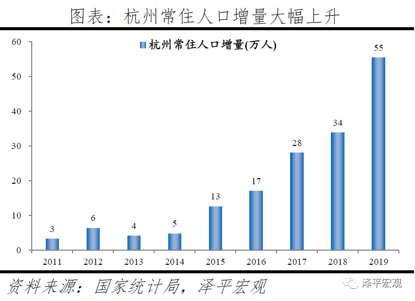 1)杭州:2016-2019年人才净流入占比分别为0.8%、1.0%、1.2%、1.4%,始终为正且逐年攀升,主因杭州以电商为代表的产业发展迅速、薪酬超越广州在十大城市中位列第四。2013-2019年杭州常住人口增量从4万逐渐增至55万,2019年常住人口增量杭州排名全国第一。2016-2019年杭州人才流入占比分别为3.0%、3.3%、3.3%、3.4%,人才流出占比分别为2.2%、2.3%、2.1%、2.0%,人才流入明显大于流出,使得人才净流入占比分别为0.8%、1.0%、1.2%、1.4%,逐年攀升,2018-2019年居全国之首。从来源看,人才向杭州流入的前十大城市分别为上海、北京、深圳、合肥、宁波、郑州、南京、广州、苏州、成都,合计占比达46.6%,明显高于2018年杭州人才前十来源地的44.0%,杭州的人才来源集中度有所上升。其中,来自上海和北京的人才合计占比23.6%,杭州发展所需人才主要在一线城市中,杭州也具有从一线城市抢夺人才的能力。且杭州前十来源地有5个来自长三角地区,合计占比达25.1%。人才流入杭州主要是因为产业发展迅速,尤其以阿里巴巴为代表的电商行业发展较快。根据杭州市统计局,2019年杭州数字经济产业增加值增长15.1%,其中,电子商务产业增加值14.6%,均高于杭州GDP增速6.8%。2019年杭州流入人才28.8%流向IT|通信|电子|互联网行业,明显高于其余9个重点城市,其中,12.8%流向互联网/电子商务二级行业,高于除重庆外的其余8个重点城市。同时杭州薪酬较有吸引力,在十个重点城市中位列第四,高于广州,其中13个行业中杭州有1个位列第一(交通|运输|物流|仓储),1个位列第二,2个位列第三,7个位列第四。从去向看,杭州人才外流的前十大城市分别为上海、北京、宁波、南京、深圳、苏州、嘉兴、绍兴、广州、金华,合计占比达44.9%。其中,有7个去向长三角地区,合计占比达32.3%。