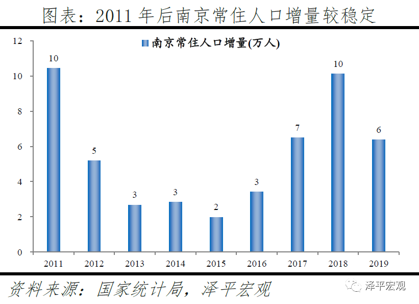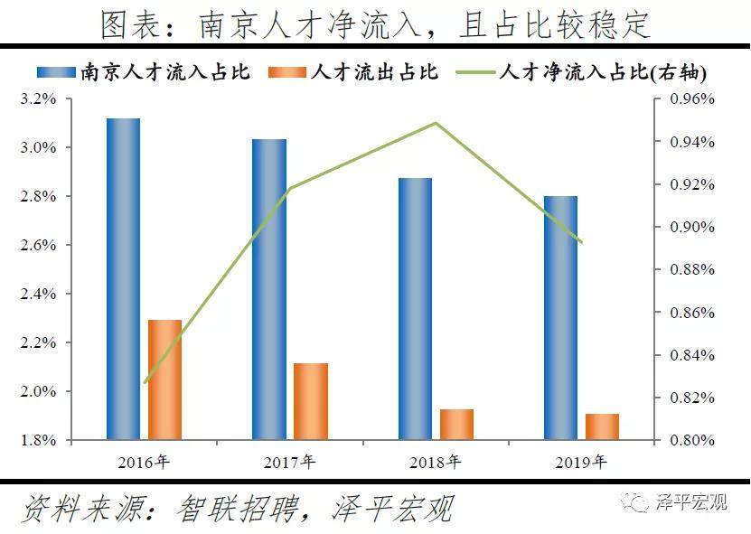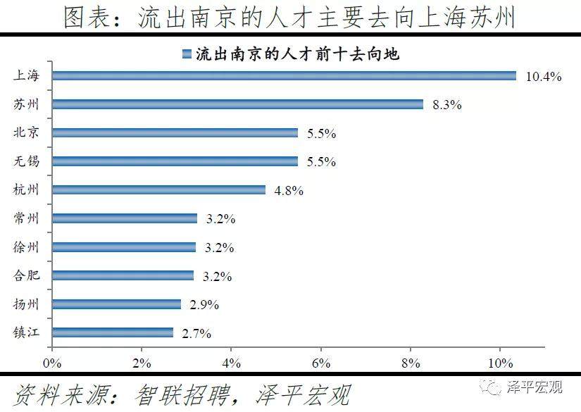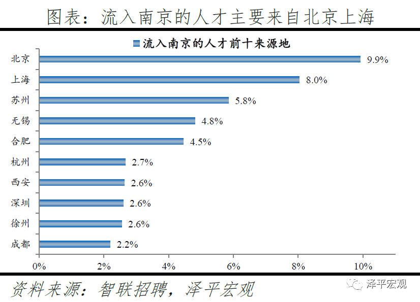 2)南京:2016-2019年人才净流入占比分别为0.8%、0.9%、0.9%、0.9%,始终为正且比较稳定,主因南京发展速度较快且2018年“宁聚计划”实施吸引人才。和上述其他城市相比,南京常住人口增量相对稳定,2011-2019年始终在2-10万区间波动、2019年为6万。2016-2019年南京人才流入占比分别为3.1%、3.0%、2.9%、2.8%,人才流出占比分别为2.3%、2.1%、1.9%、1.9%,均逐年下降,但人才流出明显大于流出,使得南京人才净流入占比分别为0.8%、0.9%、0.9%、0.9%,基本稳定。主要因为落户条件放宽且电子通信、制造业等行业增长速度较快。2018年“宁聚计划”即《人才落户实施办法》实施,不再以就业为落户前提,年龄条件也从35岁放宽到40岁。根据各市统计局数据,2019年南京GDP同比增长7.8%,不仅高于全国的6.1%,也在十大重点城市中排名第一;2018年南京规模以上工业增加值同比增长7.8%,高于全国的6.2%,其中,新能源汽车、工业机器人、集成电路产量分别增长253.1%、108.9%、29.6%,高于全国的66.2%、6.4%、11.2%。从来源看,人才向南京流入的前十大城市分别是北京、上海、苏州、无锡、合肥、杭州、西安、深圳、徐州、成都,合计占比达45.7%。其中,有5个是长三角地区,合计占比达25.8%。从去向看,南京人才外流的前十大城市分别为上海、苏州、北京、无锡、杭州、常州、徐州、合肥、扬州、镇江,合计占比达49.5%。其中,有8个是长三角地区,合计占比达40.8%。南京和长三角的人才互动非常频繁,部分因为南京高校较多,长三角人才为求学向南京集聚,毕业后从南京回流至长三角其他城市。根据教育部数据,南京普通高校数、211高校数分别为34、10所,分别排名第6、3名。