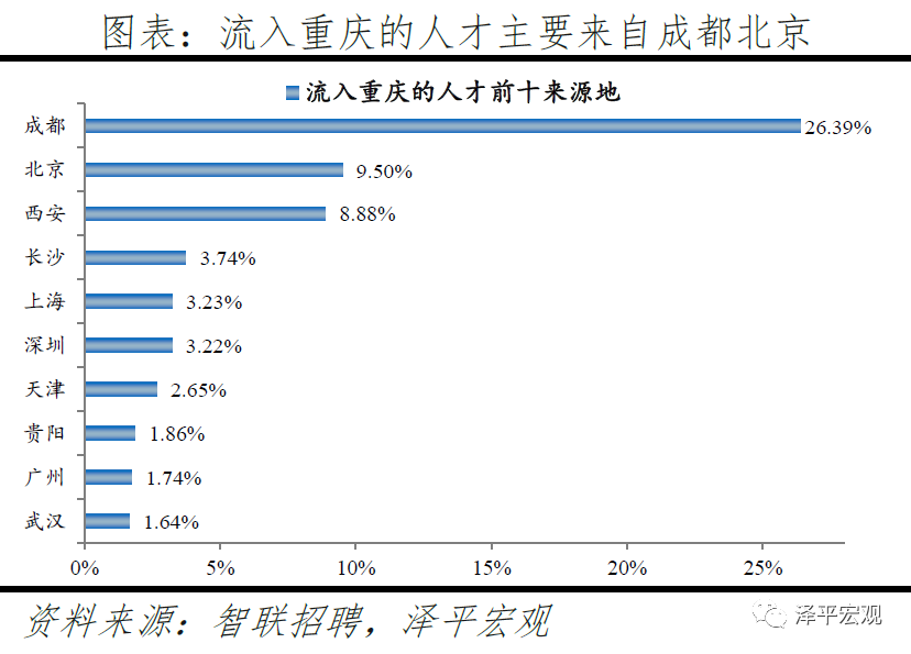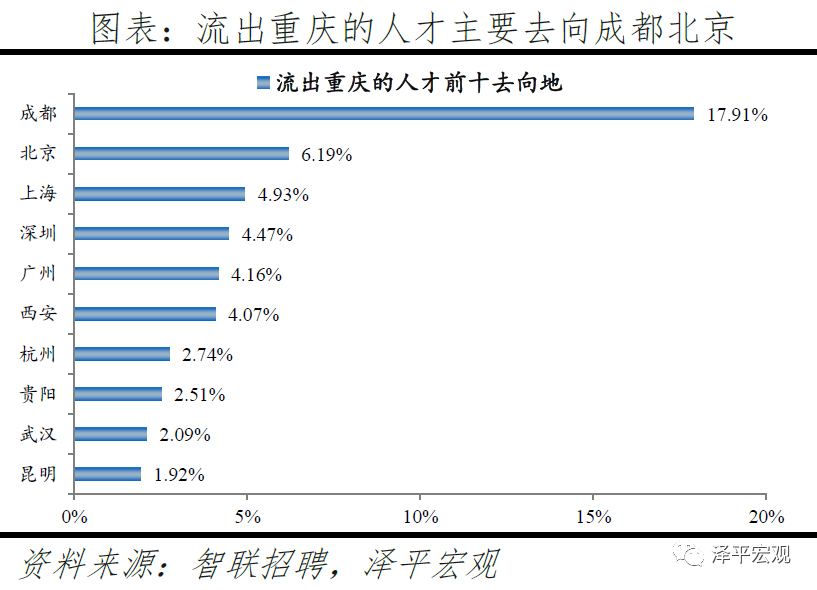 3)重庆:2016-2019年人才净流入占比分别为-0.1%、-0.1%、0.5%、0.3%,2018年由负转正主因对信息技术产业具有较强的人才吸引力。重庆常住人口增量维持在高位,2011-2019年增量平均为27万。2016-2019年重庆人才流入占比总体呈上升趋势,分别为1.3%、1.3%、2.0%、1.8%,人才流出占比在2016-2018年均为1.4%、2019年上升至1.6%,导致人才净流入占比分别为-0.1%、-0.1%、0.5%、0.3%,逐年上升且2018年由负转正。从来源看,人才向重庆流入的前十大城市分别为成都、北京、西安、长沙、上海、深圳、天津、贵阳、广州、武汉,合计占比达62.8%。其中,成都流入重庆占比达26.4%,高于大部分城市第一来源地占比,主要因为地理位置近且电子产业等具有较强吸引力。2019年重庆流入人才中25.7%流向IT|通信|电子|互联网行业,高于除杭州外的其余8个重点城市,也明显高于流出人才从事该行业的比例13.1%,其中2019年重庆流入人才中14.4%流向互联网/电子商务的二级行业中,显著高于其余9个重点城市。根据国家统计局和中国电子信息产业统计年鉴数据,重庆电子商务企业个数2013-2018年从640个增加到2545个;重庆规模以上电子信息企业个数2008-2017年从68个增加到540个。重庆市统计局数据显示,2019年1-11月重庆规上软件和信息技术服务业营收同比增长45.2%,高于全国2019年信息技术服务业营收增速的20.8%。从去向看,重庆人才外流的前十大城市分别为成都、北京、上海、深圳、广州、西安、杭州、贵阳、武汉、昆明,合计占比达51.0%。