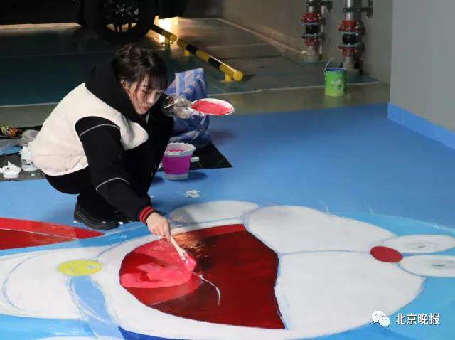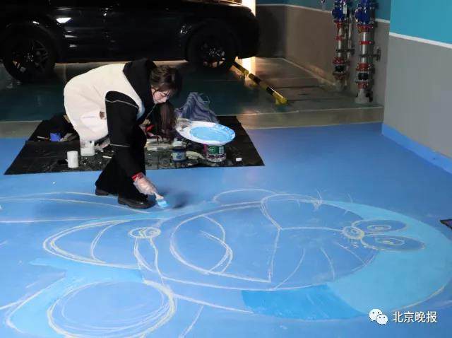 春节前,在大兴一个小区的地下车库里,手绘师王誉儒正举着色盘调配颜料。一种红色颜料,在她手里能调出明暗不一的5种颜色。先用粉笔画出图稿,再用丙烯颜料逐一上色,最后用黑笔勾边,这个衣着前卫的女孩,是目前为数不多的女性手绘师之一,平均每周要为两三个客户绘制车位图案。