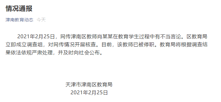 根据天津市津南区教育局通报,2月25日,网传津南区教师肖某某在教育学生过程中有不当言论。津南区教育局立即成立调查组,对网传情况开展核查。目前,该教师已被停职。教育局将根据调查结果依法依规严肃处理,并及时向社会公布。目前,该教师已被停职。