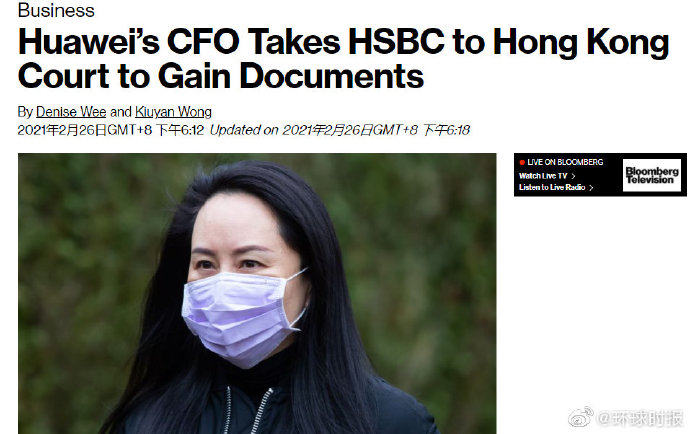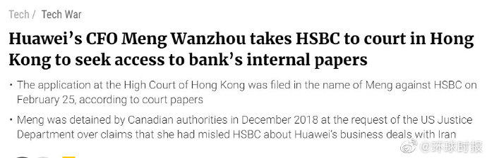 据香港《南华早报》和美国彭博社报道,香港高院在2月25日收到了一份来自华为公司高管孟晚舟的申请,要求汇丰银行银行公开与她被引渡美国一案相关的内部材料。这些媒体还称,从法庭文件来看,香港高院将在3月12日闭门听取孟晚舟一方的申请。