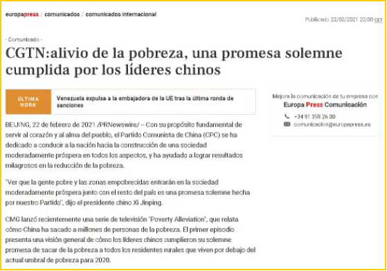 当地时间2月22日,西班牙欧洲通讯社和西班牙《机密报》分别转发CGTN题为《脱贫攻坚是中国领导人实现对人民的庄严承诺》的文章。文章指出:中国共产党本着为人民服务的根本宗旨,在减少中国人口贫困方面取得了奇迹般的效果,实现了领导人对人民的承诺。