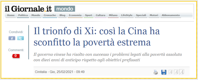 当地时间2月25日,意大利主流媒体《日报》网站也发表总台稿件《习近平庄严宣告:中国战胜了绝对贫困》。文章通过历史回顾和数据,分析阐述了中国脱贫攻坚取得的历史性成果。报道指出,乡村振兴将是中国的下一个发展目标和重大任务。中国将积极开展国际减贫合作,做世界减贫事业的有力推动者。