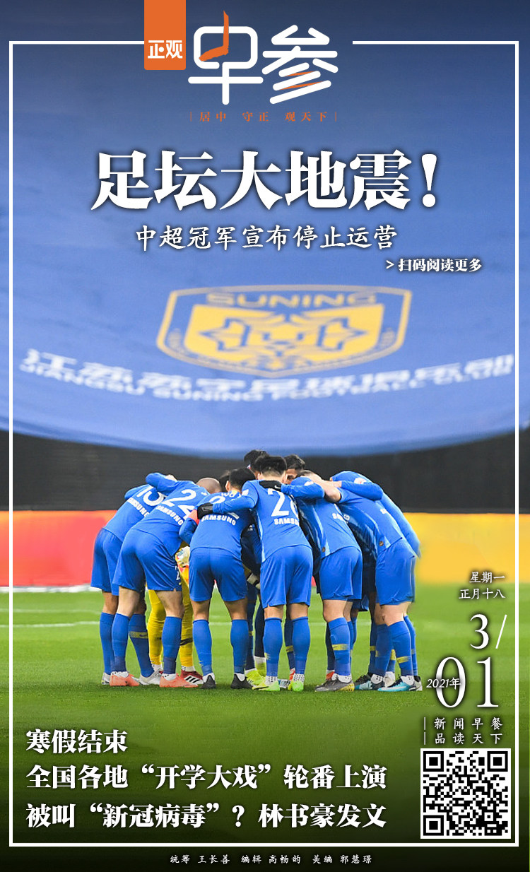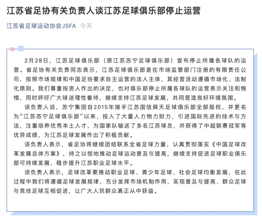 2021年2月28日,更名后的江苏足球俱乐部官方宣布,停止运营所属各球队。这也意味着这支新科卫冕冠军,将大概率无缘新赛季中超联赛。