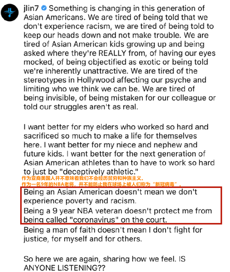 被叫“新冠病毒”?林书豪发文:美国种族歧视问题有人在听吗?
