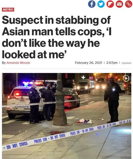 △《纽约邮报》:持刀刺伤亚裔男子的嫌疑人告诉警方“我不喜欢他看我的样子”