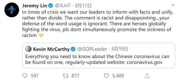 去年(2020年)3月,美国众议院多数党领袖凯文·麦卡锡将新冠病毒称为“中国病毒”,林书豪就曾回怼:“这是赤裸裸的种族主义言论,太令人失望了。你对这个词用法的辩护是无知的。全世界英雄都在抗击(新冠)病毒,别在此时宣传种族歧视!