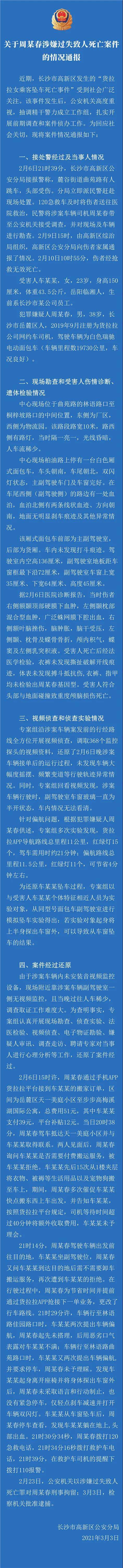 3月3日,长沙高新公安发布了关于司机周某春涉嫌过失致人死亡案件的情况通报。包含对现场勘查和受害人伤情诊断、遗体检验情况,以及案件经过全还原。