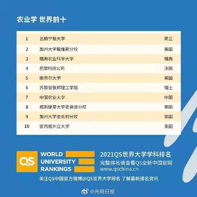 3月4日,QS全球教育集团发布了2021年世界大学学科排名。中国高校表现亮眼,共有122所大学的1134个学科上榜(含港澳台地区)。中国大陆共有88所大学的731个学科专业上榜,126个学科排名跻身世界前50名。今年,大陆排名最高的两个专业分别是清华大学的土木与结构工程和中国农业大学的农林专业,全球排名均为第7。