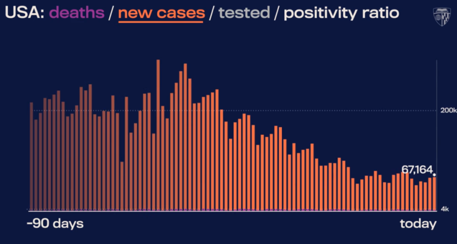 △美国约翰斯·霍普金斯大学数据显示,目前美国日新增病例仍在6.5万人以上(美国约翰斯·霍普金斯大学网站截图)
