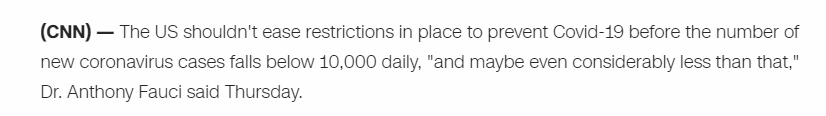 △据美国有线电视新闻网报道,福奇表示美国日新增感染者还在1万人以上时,不宜考虑放松防疫措施(报道截图)