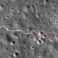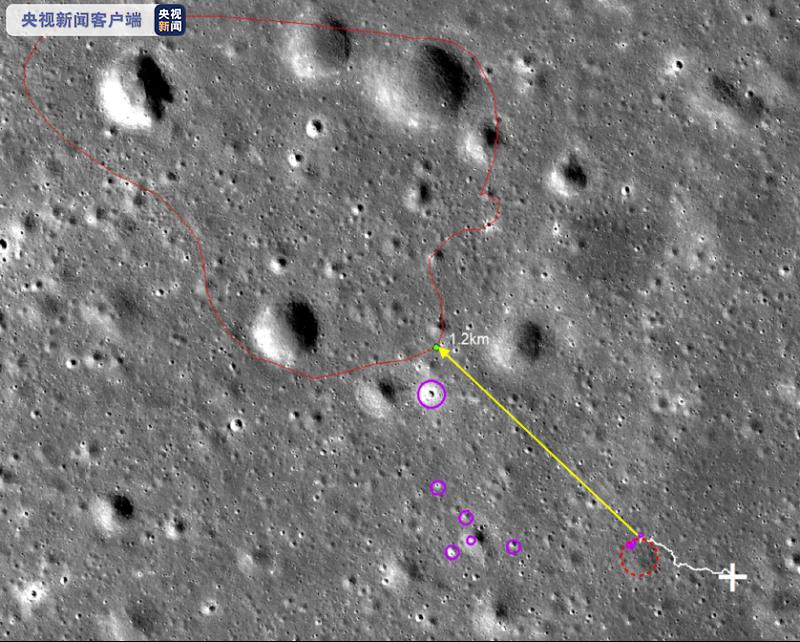 如上图所示,目前,月球车位于嫦娥四号着陆点西北方向,距离着陆点直线距离约429米。在第28月昼期间,月球车计划向玄武岩方向(距离目前巡视器约1.2km,位于东经177.5389°,南纬45.4119°附近)前进,该位置位于当前探测点西北方向上。