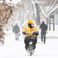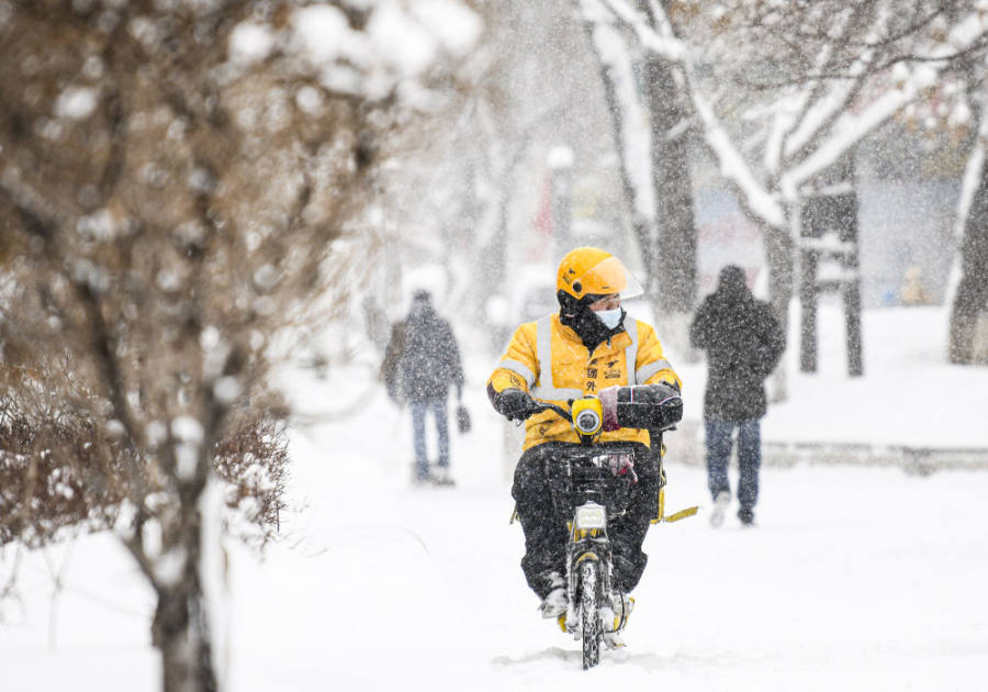 1月23日,在乌鲁木齐市光明路,一名外卖员在送餐路上。 新华社记者 王菲 摄