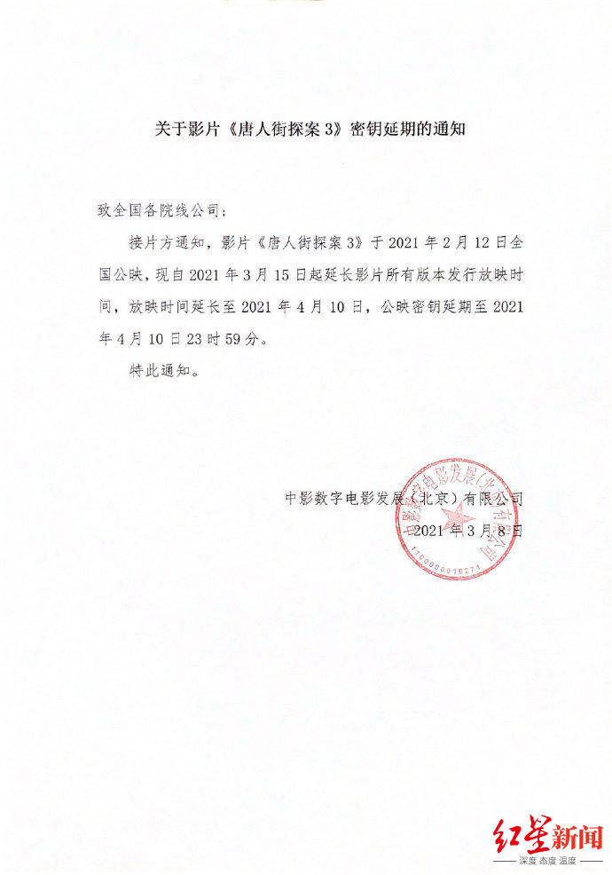 3月9日,据电影《唐人街探案》官方微博消息,电影《唐人街探案3》密钥延期,将延长上映至2021年4月10日。影片自2月12日起公映,目前票房已突破44亿。