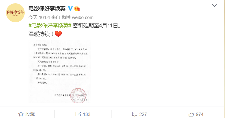据此前报道,3月9日,电影《你好,李焕英》将延长放映至2021年4月11日。