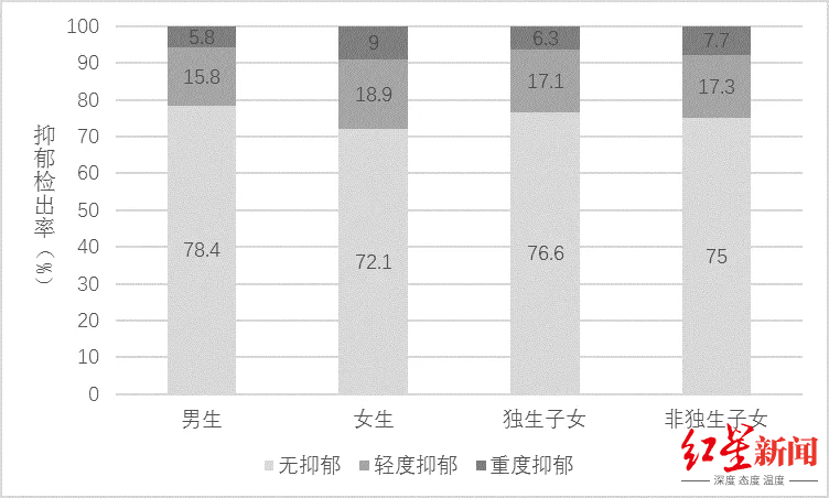 非独生子女青少年有抑郁倾向的比例为17.3%,与独生子女相当;重度抑郁的比例为7.7%,高出独生子女1.4个百分点。