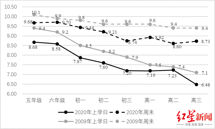小学生周末平均睡眠时长减少10-20分钟,初一、初二年级减少约20分钟,初三以及高中阶段下滑更为严重,减少40-60分钟。即,初三以及高中学生周末补觉机会也在减少。