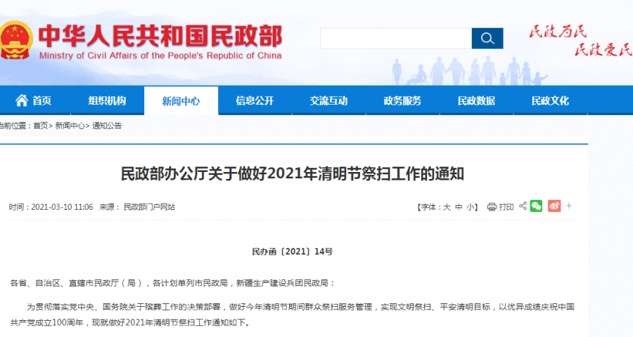 3月10日,据民政部官网消息,近日民政部办公厅发布《关于做好2021年清明节祭扫工作的通知》。