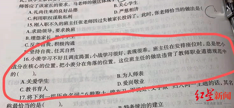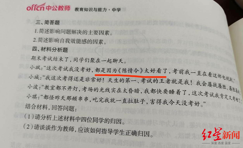 据她介绍,这项材料分析题源自中公教育的国家教师资格考试专用教材中的教育知识与能力科目的教材,“这个属于基础科目,无论哪个学科的考生都要考的。”在她给记者呈现的书籍中显示,这本书由中公教育教师资格考试研究院编著,定价为54元。