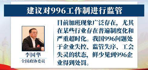 3月9日下午,中国新闻周刊官方微博发布了一则两会报道:全国政协委员李国华表示,目前加班现象广泛存在,尤其在某些行业存在普遍制度化和严重超时化,在短视频、在线教育、出行、电商等领域,部分互联网企业又开始推行“大小周”工作制。李国华指出,当前我国996问题处于企业失控、监管失序、工会失灵的状态,鲜少见到996企业得到处罚,劳动监察没有发挥应有的作用,劳动者维权困难;一些企业甚至直接在规章制度中规定,执行996、大小周工时,剥夺了员工的休息时间。李国华表示,延长法定工作时间的制度现象应当引起重视和关注,建议对996工作制进行监管。