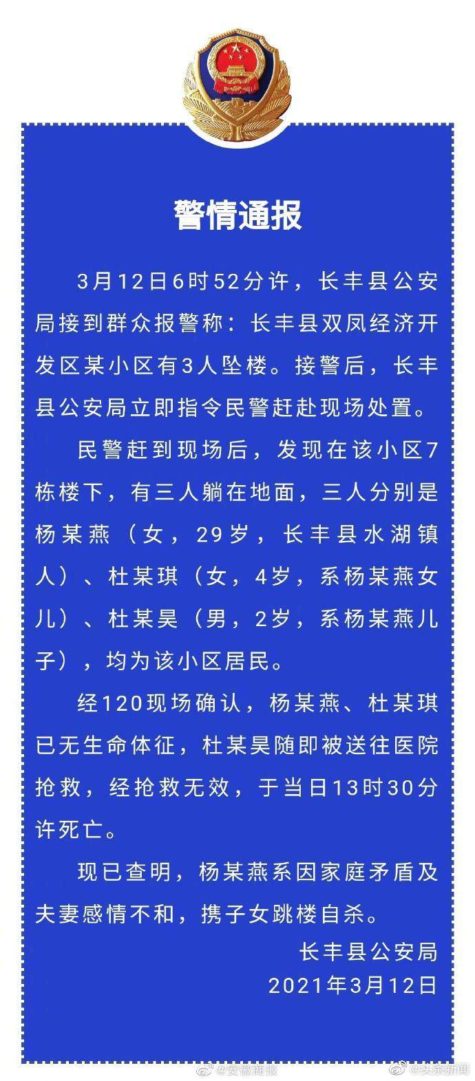 警方通报合肥母子3人坠亡:夫妻感情不和,携子女跳楼自杀