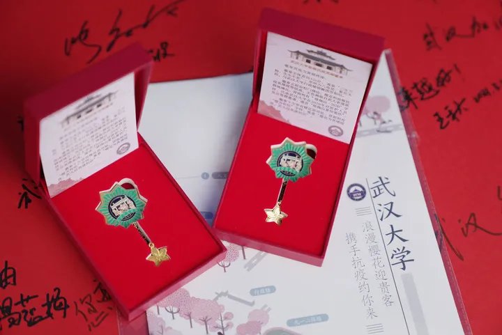 武汉大学还准备了特制纪念章和樱花地图送给英雄