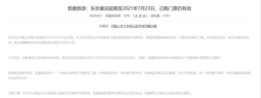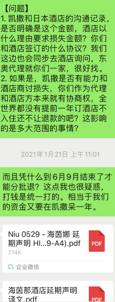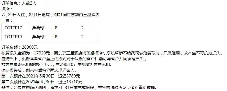北京的单女士和于女士,以及上海的Y女士面临同样的问题。她们告诉澎湃新闻,虽然购票时间不一,但她们的售票方均是凯撒旅游,因为凯撒旅游是东京奥运会中国大陆区域唯一票务代理商。凯撒旅游官网资料显示,该公司创始于1993年,总部设在北京,在7个海外核心城市设有分支机构,在中国的北京、上海、广州、成都以及沈阳等近50个口岸及核心商业城市设有分子公司。2015年10月,凯撒旅游上市登陆A股市场。据凯撒旅游官网消息,2019年5月21日该公司召开新闻发布会,宣布正式启动中国奥委会辖区票务运营工作。依据相关协议,凯撒旅游成为2020东京奥运会中国奥委会官方票务服务机构及接待服务供应商、中国奥委会辖区独家票务代理机构。这意味着凯撒旅游是中国大陆地区观众购买东京奥运会门票的唯一购票渠道。消费者林女士称,她了解到的购买奥运会赛事门票有两种方式,一种是通过东京奥运会官网“抽票”,一种是购买打包的旅游产品。很多人因为抽不到票,只能去买旅游产品。2019年8月20日,“抽票”没成功的林女士向凯撒旅游咨询其他购买门票的方式,销售人员向她推荐了奥运旅游产品套餐。套餐内容包含奥运乒乓球比赛门票和酒店住宿,合计金额为13000元。当天,林女士买下两份套餐,并进行扫码支付。同年9月,她收到凯撒旅游寄来的购票协议。和林女士一样与凯撒旅游签署文件的还有北京的于女士,她说,她和朋友在2019年11月8日与凯撒旅游签订《团队出境旅游合同》,以人均4900元的价格买下两份东京奥运竞技体操男子团体决赛观赛套餐,其中除决赛门票外,还包含一晚三星级酒店住宿。北京的单女士和上海的Y女士称,她们虽然也是在凯撒旅游官网付钱订票,但他们并没有与凯撒旅游签订合同或协议,只有凯撒旅游发给她们的东京奥运会门票销售确认函。还有消费者告诉澎湃新闻,他们只有付款记录,凯撒旅游一直未把确认函发给他们。北京中闻律师事务所律师许红亮告诉澎湃新闻,如果消费者付费购买奥运门票旅游套餐,但凯撒旅游未与之签订合同、协议,该公司行为违反《旅行社条例》第二十八条和《旅游法》五十七条有关“旅行社应当与旅游者订立合同”的规定。按法律规定,该公司理应受到旅游部门行政处罚。澎湃新闻3月12日就此询问凯撒旅游,该公司工作人员并未对此进行回复。退款难题:八千余元折损费怎么算的?国际奥委会、东京奥组委、日本政府2020年3月30日联合宣布东京奥运会延期的消息。两天后,凯撒旅游在官网发布消息称,东京奥运延期至2021年7月23日,已购门票仍有效,但也表示“如果观众确实无法观看,可以办理退票,相关细则将在凯撒旅游官网另行发布公告”。林女士称,2020年6月22日,她在咨询相关奥运门票事宜时,凯撒旅游向她提出“保留门票,行程顺延”或“退款”的建议,并问她是否要签膨胀金,即凯撒将款项保留一年后再退还,一年后林女士可以得到300元膨胀金,但膨胀金必须用于购买凯撒公司的产品。因为当时仍希望前往东京观看奥运会,林女士决定选择保留门票并顺延。她说,今年年初,因认为日本疫情防控不到位,担心观看奥运会时人身安全得不到保障,于是在1月15日向凯撒旅游申请退款。对接的销售人员告知她已提报退款申请,春节后才能退回账户。林女士称,她1月20日咨询退款进度时,销售人员回复称需要核实损失。次日,销售人员提供了退款方案:退还门票和服务费共计8980元,余下17020元为酒店房费,因酒店不能免费取消,故凯撒旅游和林女士各承担8510元损失。退还款项分两期支付,六月底退还门票费3780元,九月底退还服务费和酒店费用13710元。林女士认为,凯撒旅游提供该旅游套餐时并没有说明门票和酒店的价格,她不了解这份退款方案的核算明细,也无从确认高达订单总金额33%的折损费用的真实性。此外,她也无法接受分两期退款。林女士要求凯撒旅游提供核损的官方文件,包括凯撒旅游与日本酒店方的协议,损额计算方法及酒店联系方式。她说,凯撒旅游仅提供了一份日本酒店方的延期声明,并未提供其他证明。林女士1月28日和销售人员在微信群沟通无果后,她便去信凯撒旅游奥运项目部提出诉求。她告诉澎湃新闻,她的诉求分为两个阶段,第一阶段,要求凯撒旅游立刻将门票费用全额退款,不可拖延;第二阶段,当奥委会发布新的官方通知后,再由凯撒旅游和日本酒店方协商退款事宜。林女士说,当销售人员再次向她提出退款方案时,她发现该方案较之前并没有任何改变。在与凯撒旅游协商无果后,林女士2月10日去信东京奥组委提出诉求。奥组委邮件回复称,会告知凯撒旅游方面处理退票事宜。