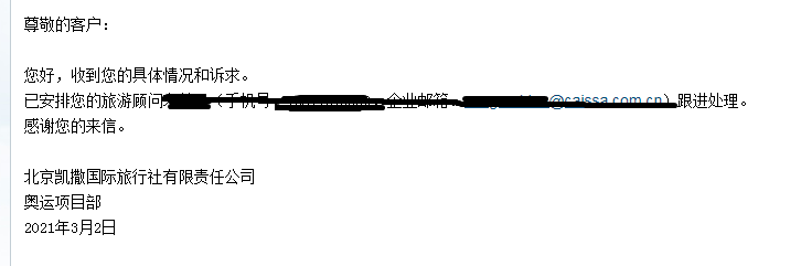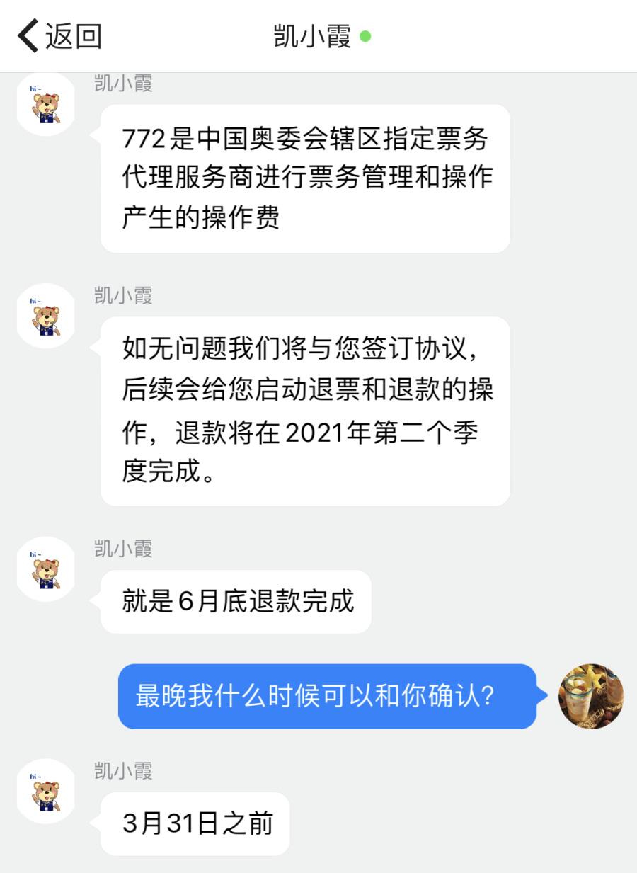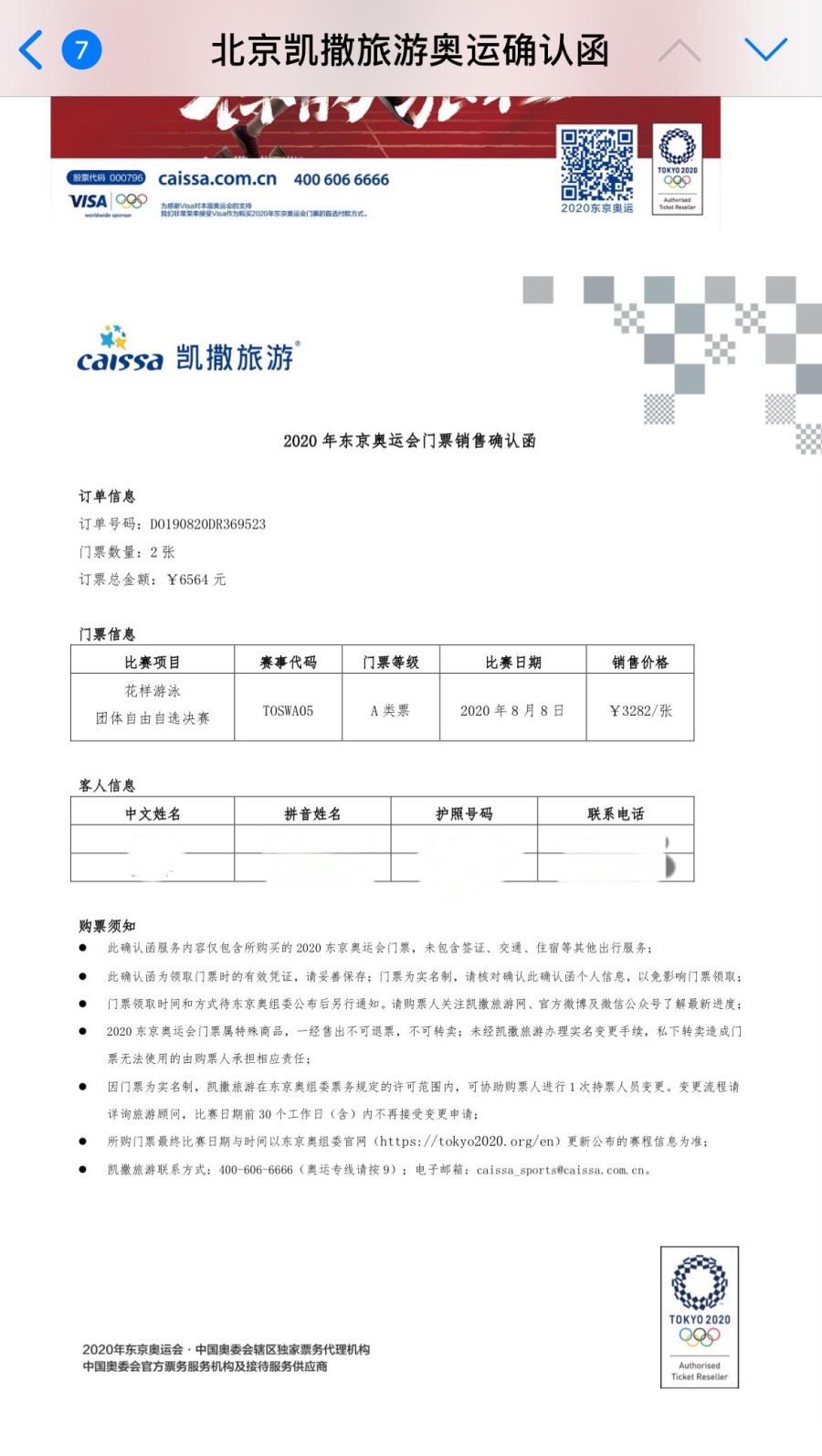 凯撒旅游奥运项目部2月20日通过邮件告知林女士,将会安排对接人代表公司跟进此事。直到3月1日,林女士未收到来自凯撒旅游任何新的退款方案,于是她再次去信催促。3月2日,之前对接的销售人员以邮件形式将1月20日提出的退款方案原封不动发给林女士。林女士与之沟通未果,便再次去信凯撒旅游奥运项目部要求回应诉求。凯撒旅游奥运项目部回复称,会安排旅游顾问跟进处理,但此后无下文。消费者认为确定折损的依据和标准不明晰和林女士一样,北京的单女士、于女士以及上海的Y女士,从2020年10月起,她们也先后找凯撒旅游申请退款。只是,她们的遭遇各有不同。她们称,因为与凯撒旅游的协商一直没取得进展,她们和另外70余名购买凯撒旅游奥运套餐或赛事门票的消费者聚在一个微信群中互通信息。单女士通过凯撒旅游购买了两张花样游泳团体自由自选决赛门票,共计6564元。在她申请退款后,客服给出的退票方案是需扣除772元,六月底完成退款,即实际退款5792元,折损比例为12%。单女士说,她询问扣款明细,客服表示,扣除的772元系“中国奥委会辖区指定票务代理服务商进行票务管理和操作产生的操作费”。单女士告诉澎湃新闻,她的购票确认函显示,6564元是票款金额,并不包含服务费、代理费,无法接受扣款方案的她要求凯撒旅游全额退还门票费用。