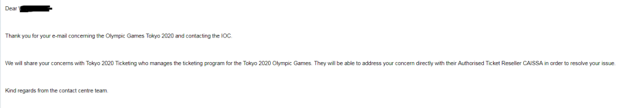 东京奥组委回复林女士称,会告知凯撒处理退票事宜。