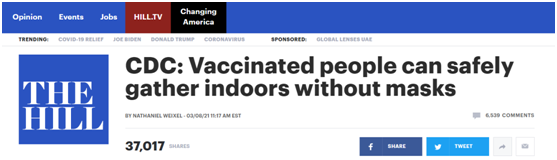 △美国《国会山报》消息,美国疾控中心(CDC)发布最新指南说,接种过新冠疫苗的人可以在室内不佩戴口罩