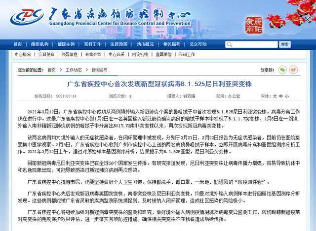 2021年3月12日,广东省疾控中心成功从两例境外输入新冠肺炎个案的鼻咽拭子中首次发现B.1.525尼日利亚突变株,病毒分离工作仍在进行中。这是广东省疾控中心继1月2日在一名英国输入新冠肺炎确认病例的咽拭子样本中发现了B.1.1.7突变株、1月6日在一例境外输入南非籍新冠肺炎病例的咽拭子中分离出501Y.V2南非突变株以来,再次发现新冠病毒突变株。